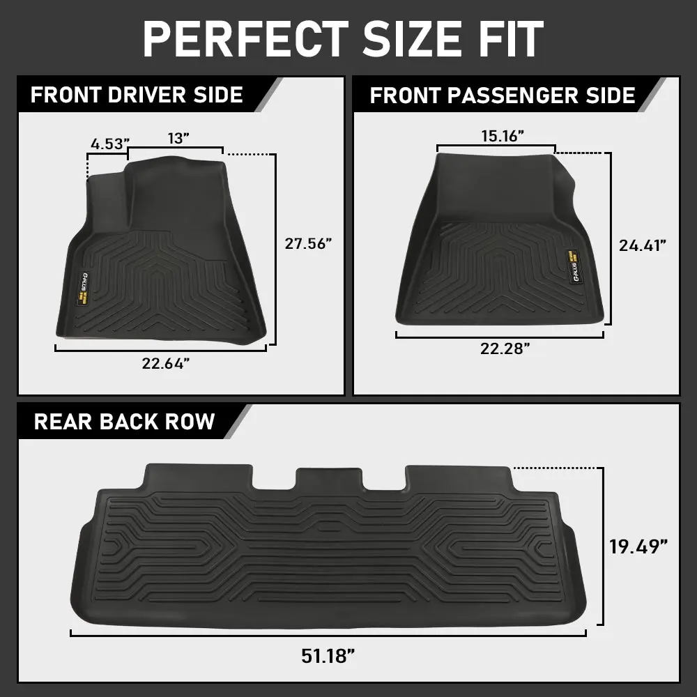 All-Weather Protection: The floor mats are waterproof and has excellent crease recovery, minimize tread marks and absorb impact, designed to withstand any weather condition while also protecting your vehicle against spills, debris, rain, snow, and mud.
