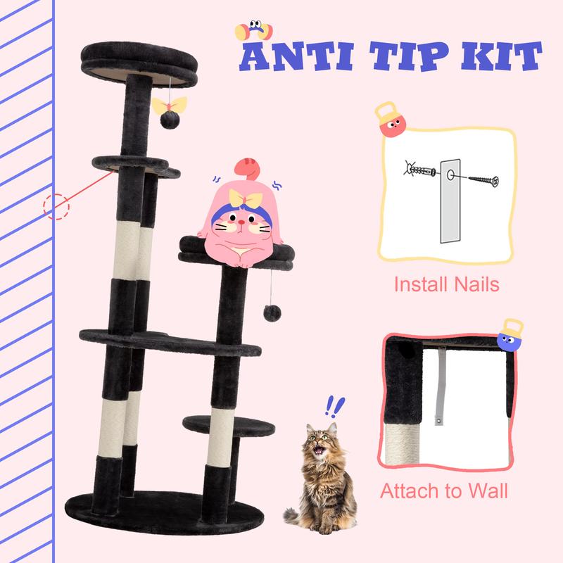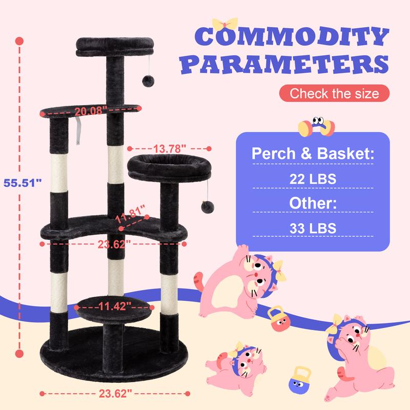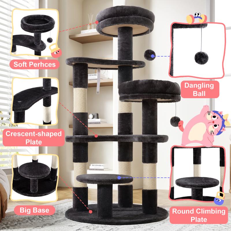Multifunctional Activity Center: Treat your cat to a multi-level haven featuring spacious perches, durable scratching posts, a cozy crescent bed, and interactive toys—ideal for chasing, napping, scratching, and exploring.