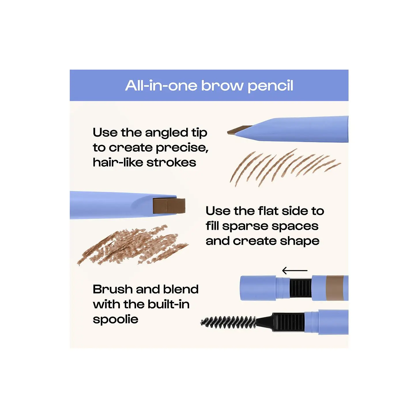 ·Innovative multi-functional design that delivers fine flicks, shape-filling definition, and built-in sharpening and grooming for natural, perfectly snatched brows.