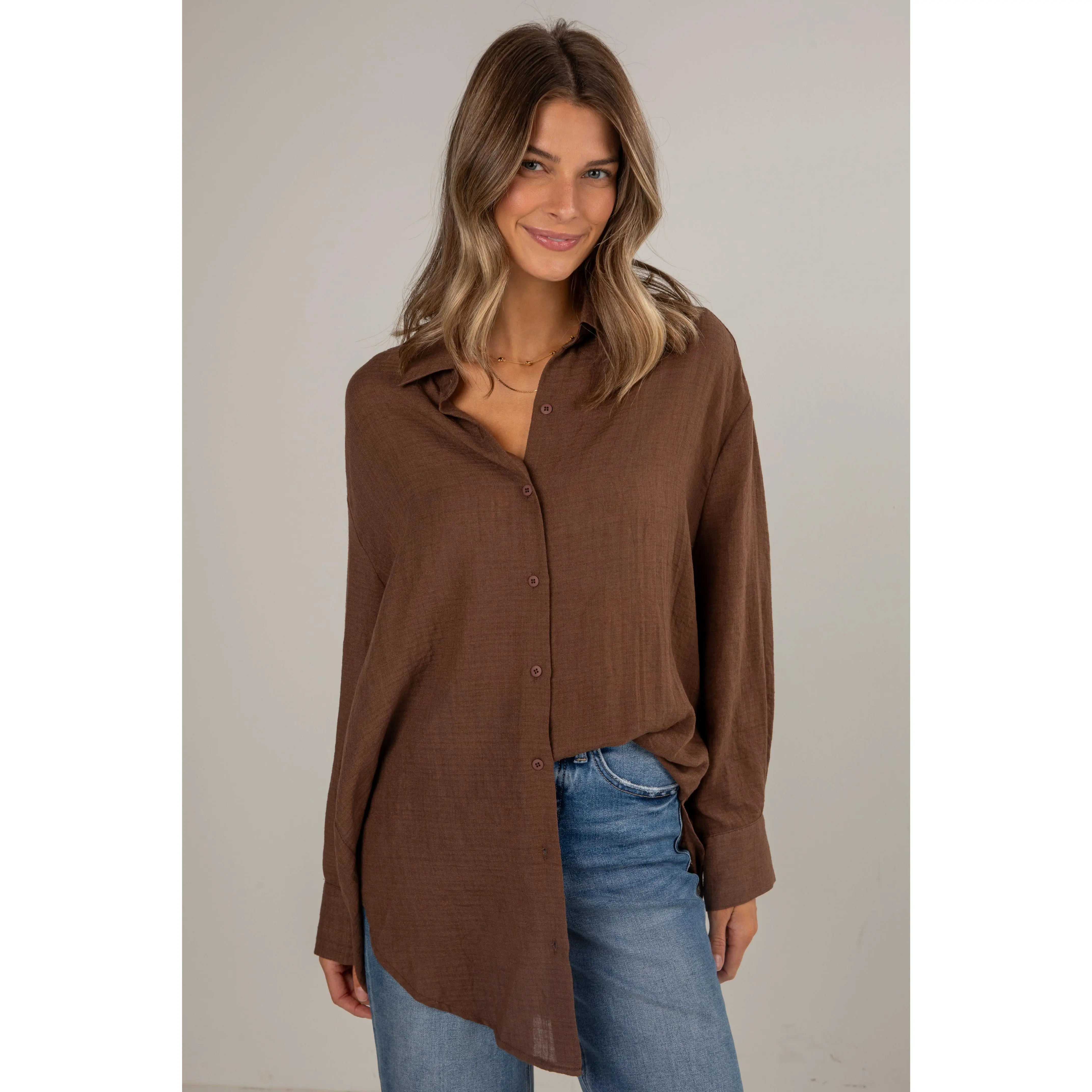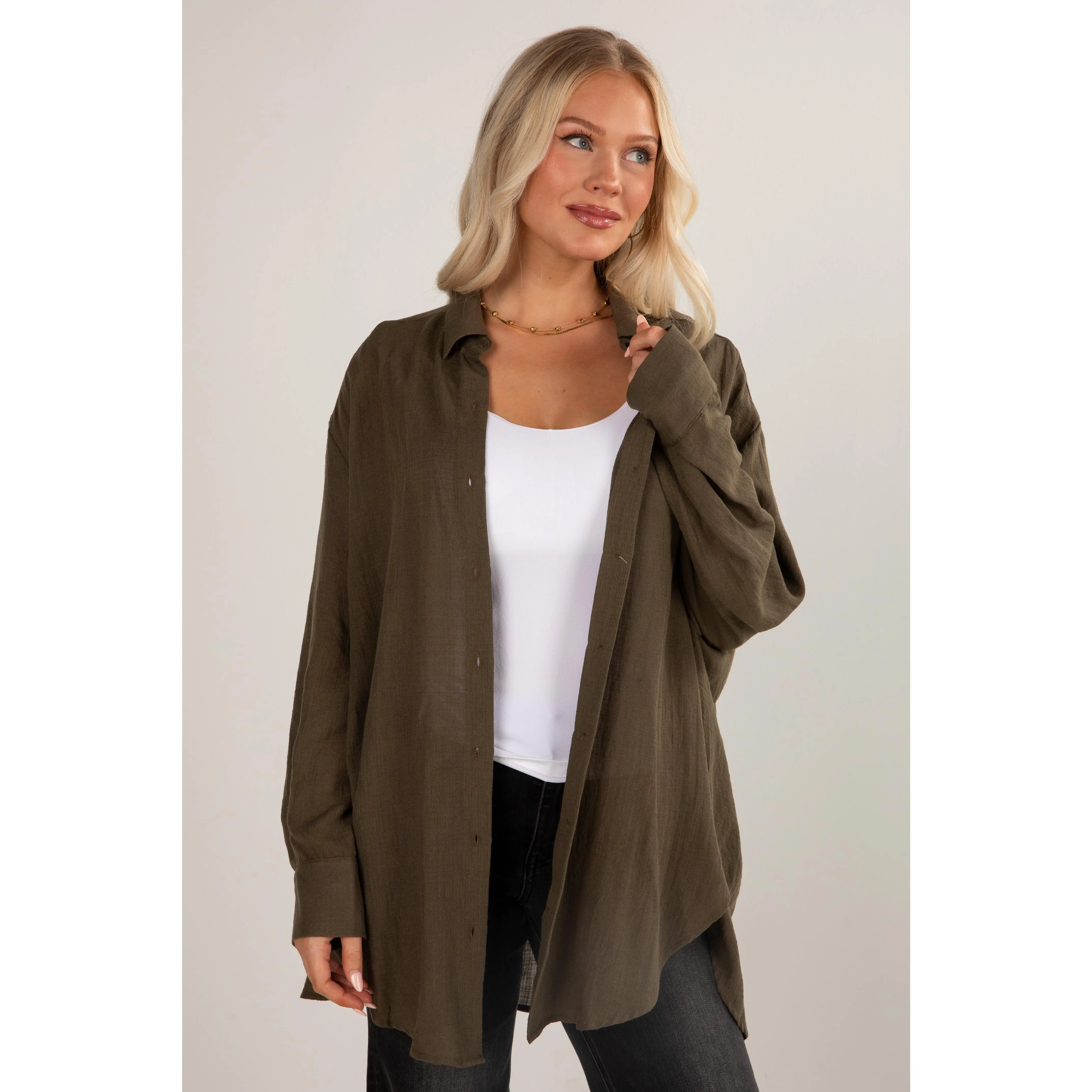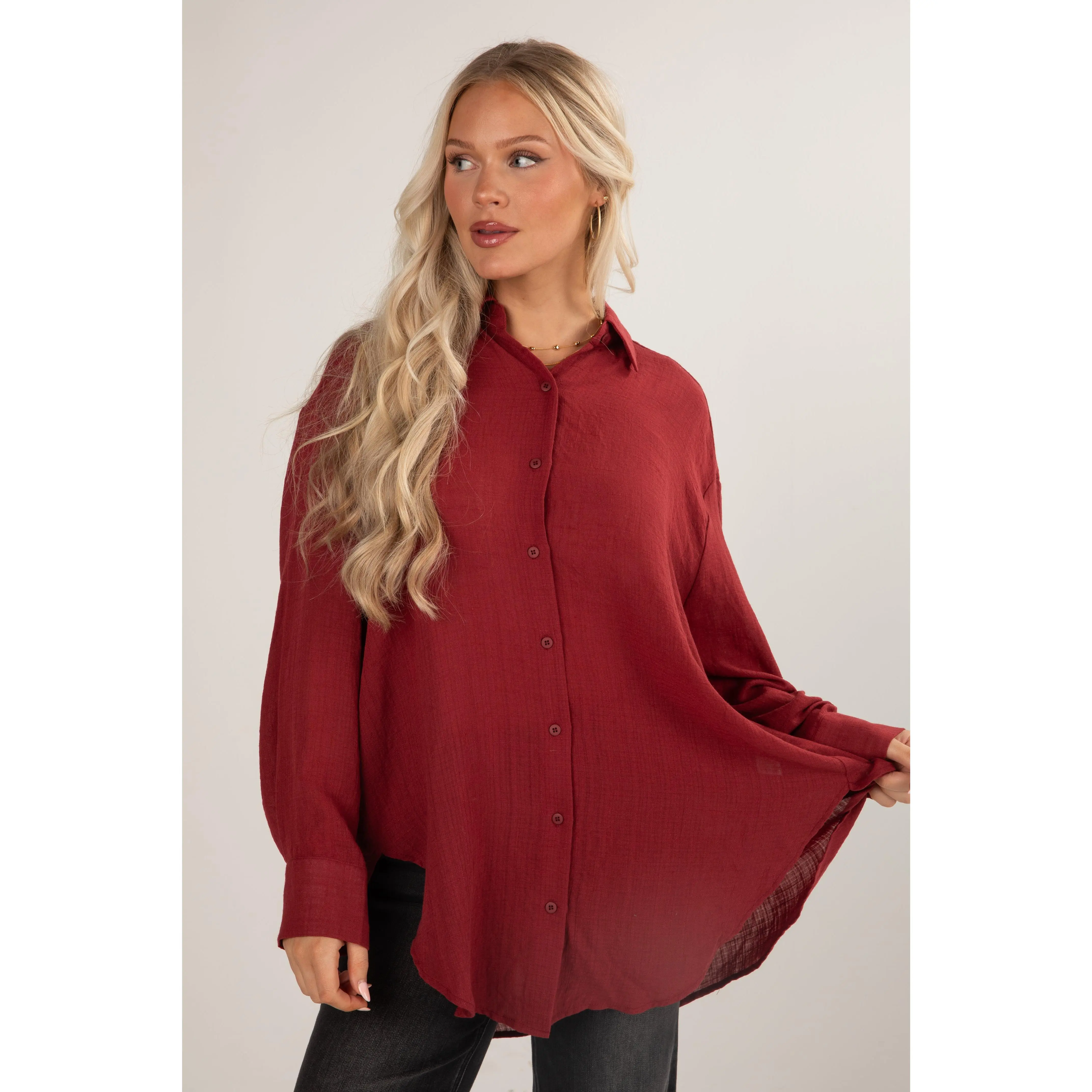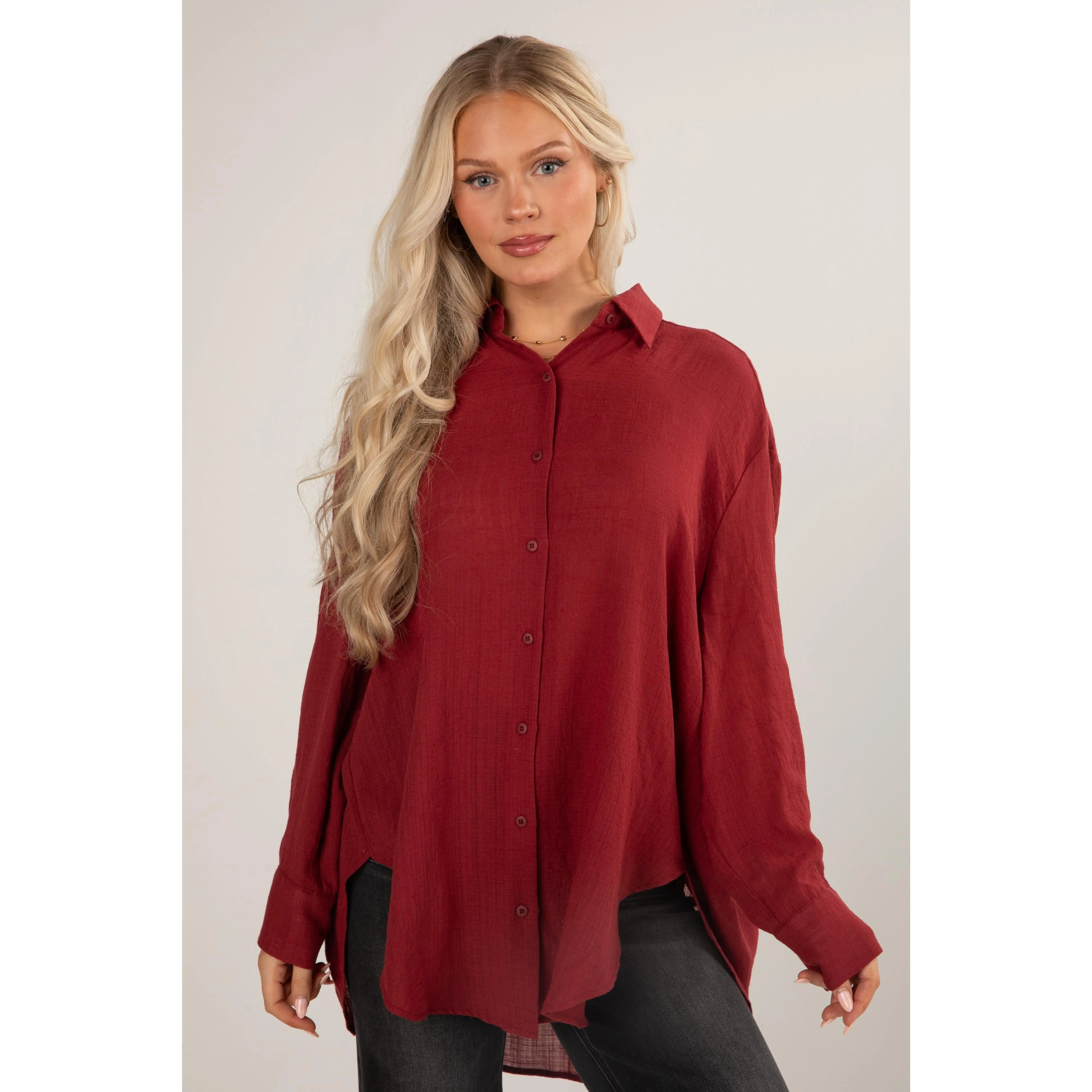 Introducing the Allison Oversized Button-Up Blouse—a versatile and effortlessly chic addition to your wardrobe! This blouse redefines classic comfort with its relaxed fit and contemporary style, offering a modern twist to a timeless silhouette. Crafted from a lightweight and breathable fabric, this oversized blouse ensures all-day comfort while exuding an air of laid-back sophistication. The loose fit drapes gracefully, providing a flattering and flowy silhouette that complements various body types. The button-up front adds a touch of classic tailoring, allowing you to adjust the neckline and style the blouse to suit your mood. Whether paired with fitted trousers for a polished look or worn loosely over denim for a casual ensemble, the blouse effortlessly transitions from day to night! Available in 17 colors.