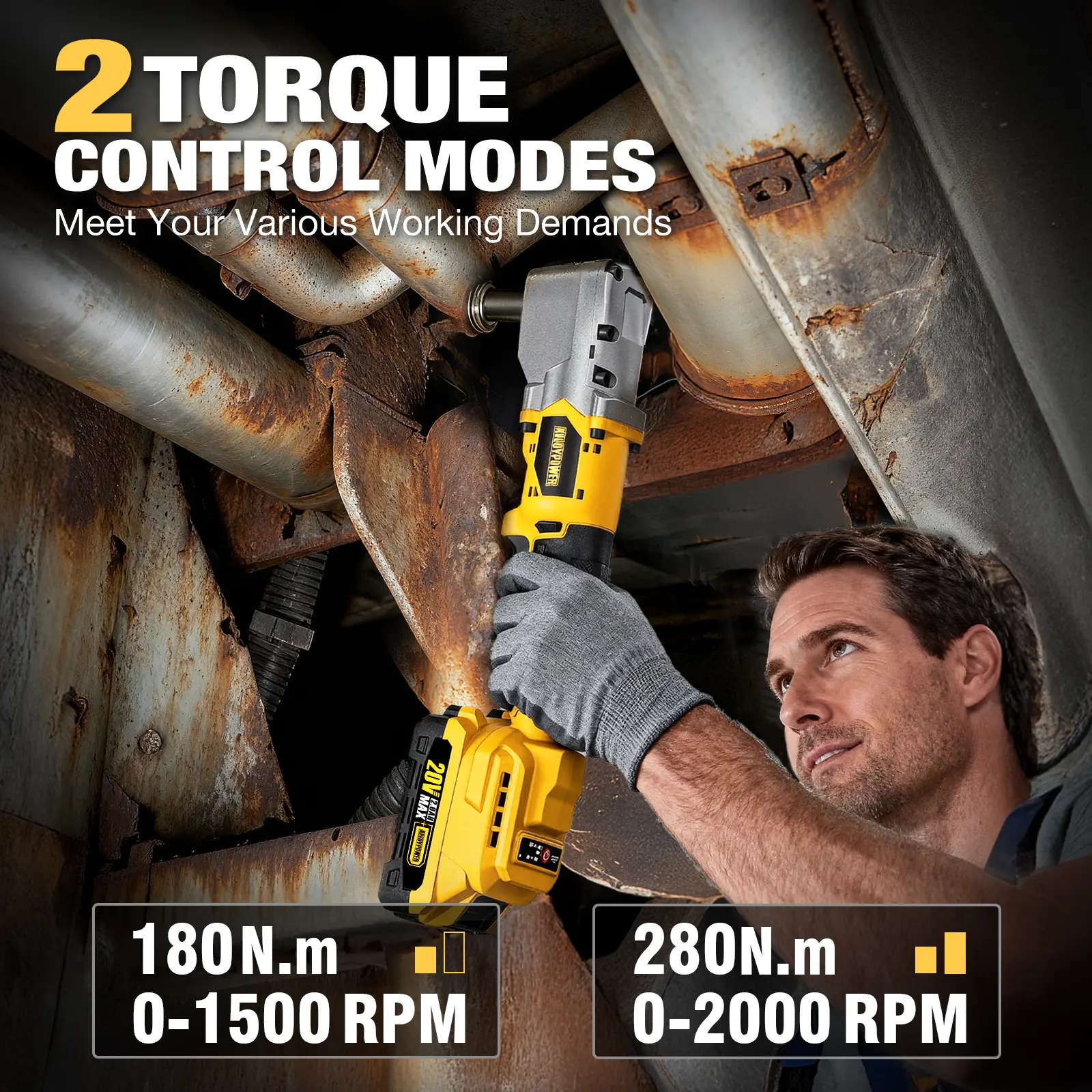 Powerful Torque: Delivers up to 207 ft-lbs (280 N·m) with 0–2000 RPM & 0–2500 IPM output. Ideal for heavy-duty tasks. Compact design fits tight spaces. Right-angle design reaches areas traditional impact wrenches can't.