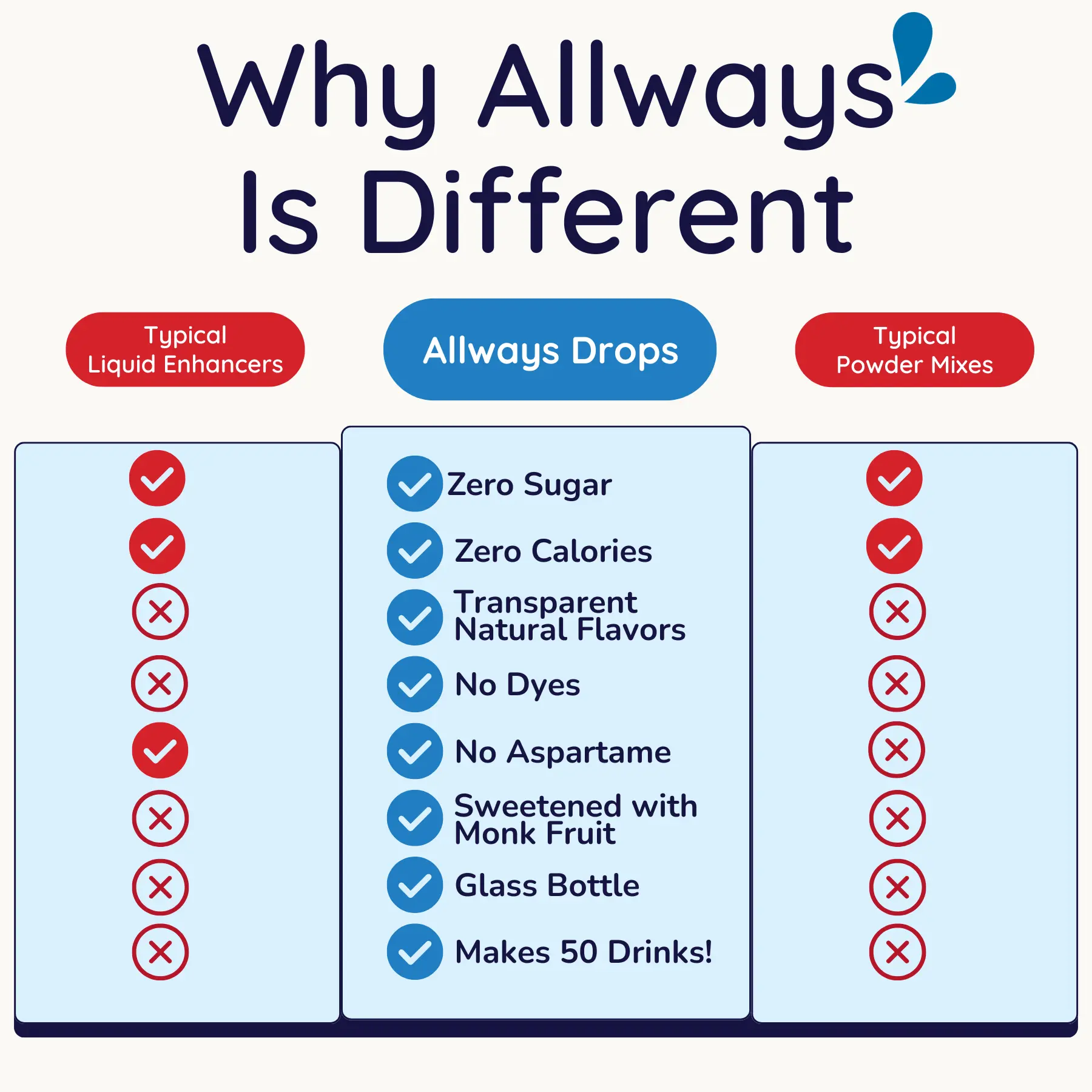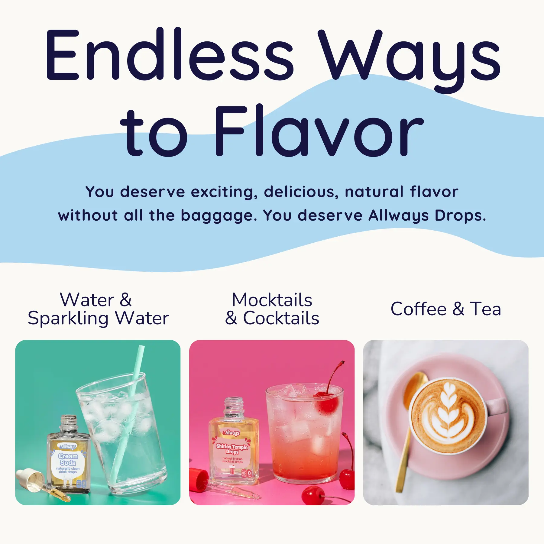 I'm trying to drink lower calorie options and have LOVED adding these allways drops to my water for a little extra flavor without the calories. The taste is AMAZING!