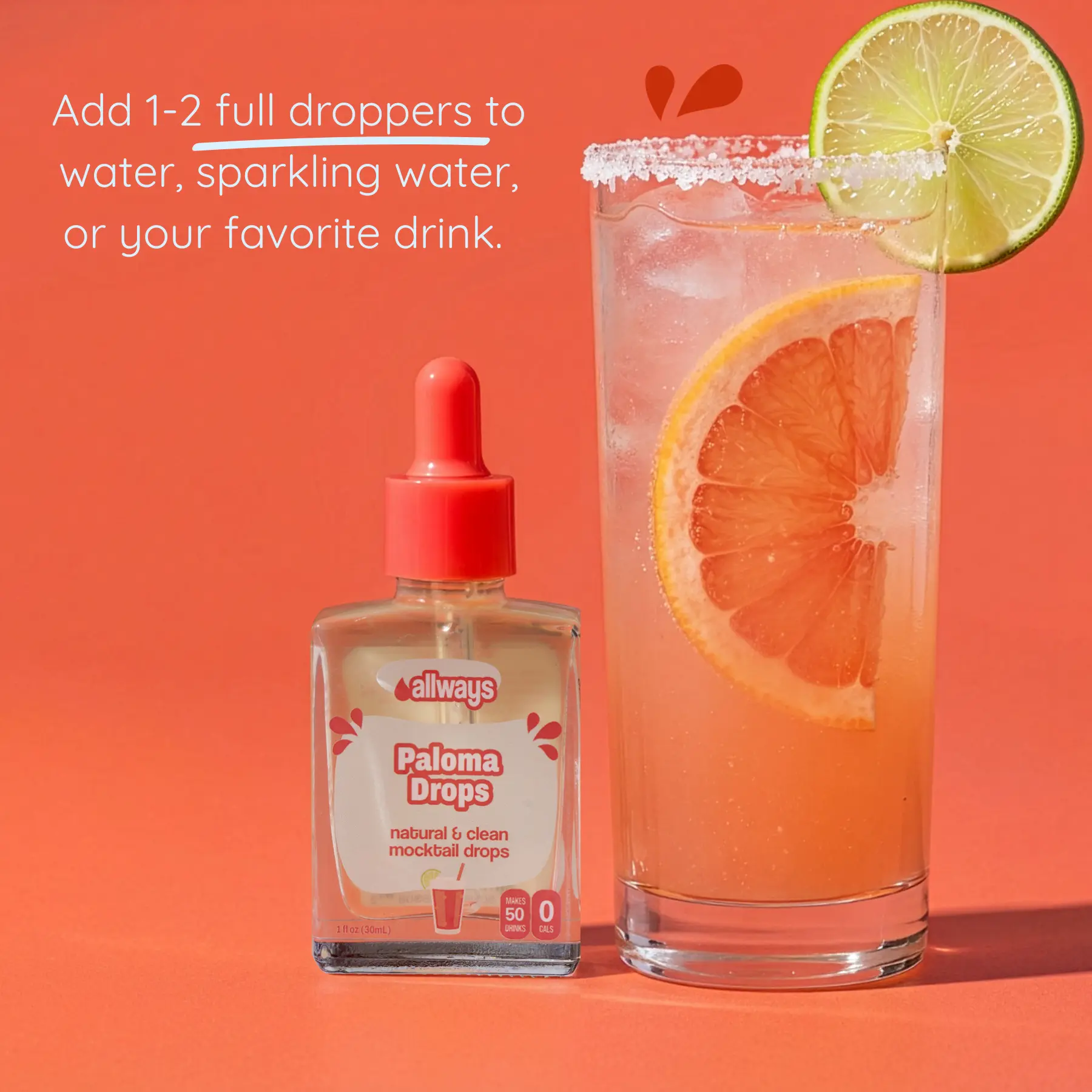 A bright burst of grapefruit mocktail magic in every drop. Add 1–2 dropperfuls to water or sparkling water (8 fl oz) to create a refreshing, sugar-free mocktail. Mix well and flavor life ALLWAYS, anywhere you go!