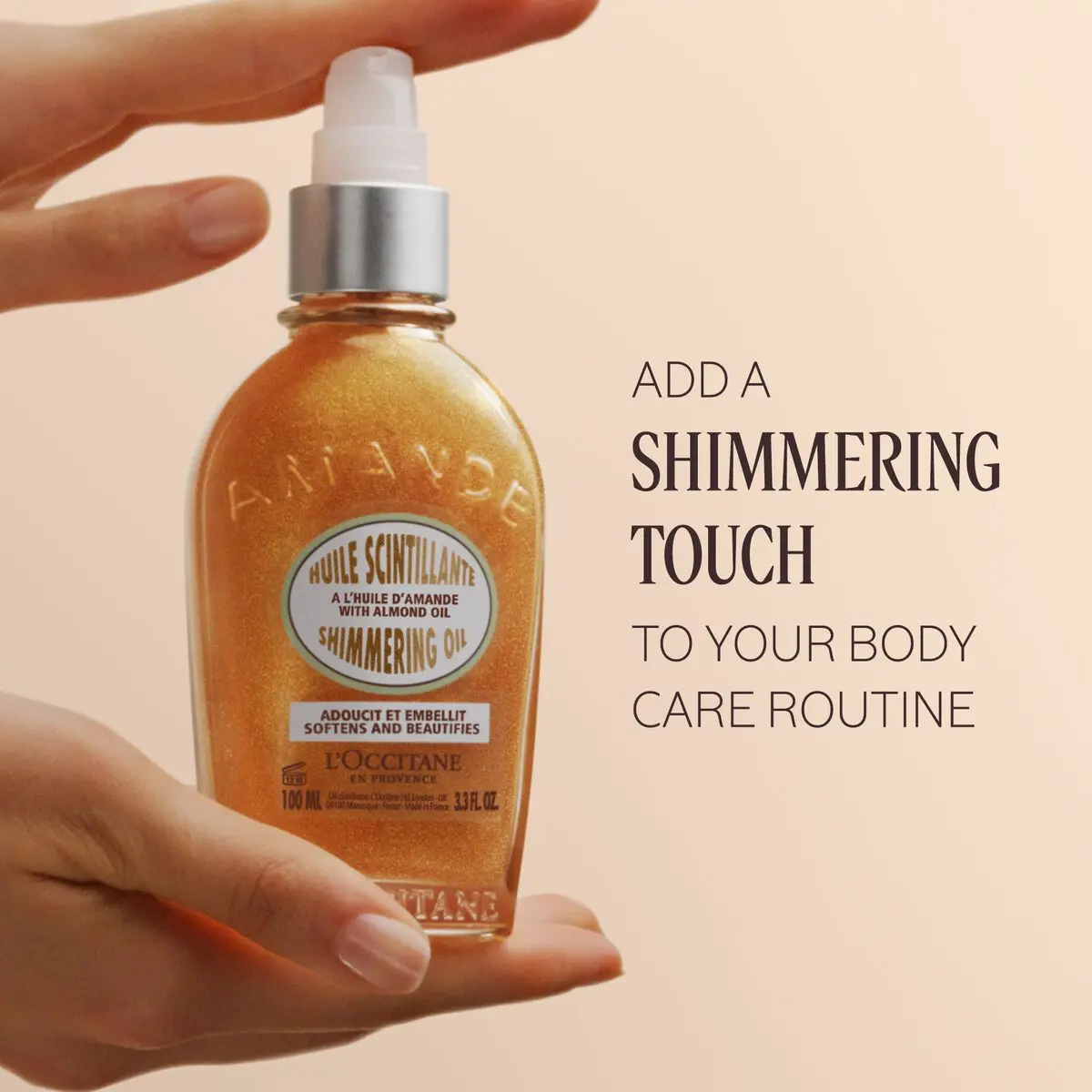 The silky Almond Shimmering Oil absorbs quickly into the skin, helping to nourish, soften, and beautify, leaving a subtle veil of shimmer.