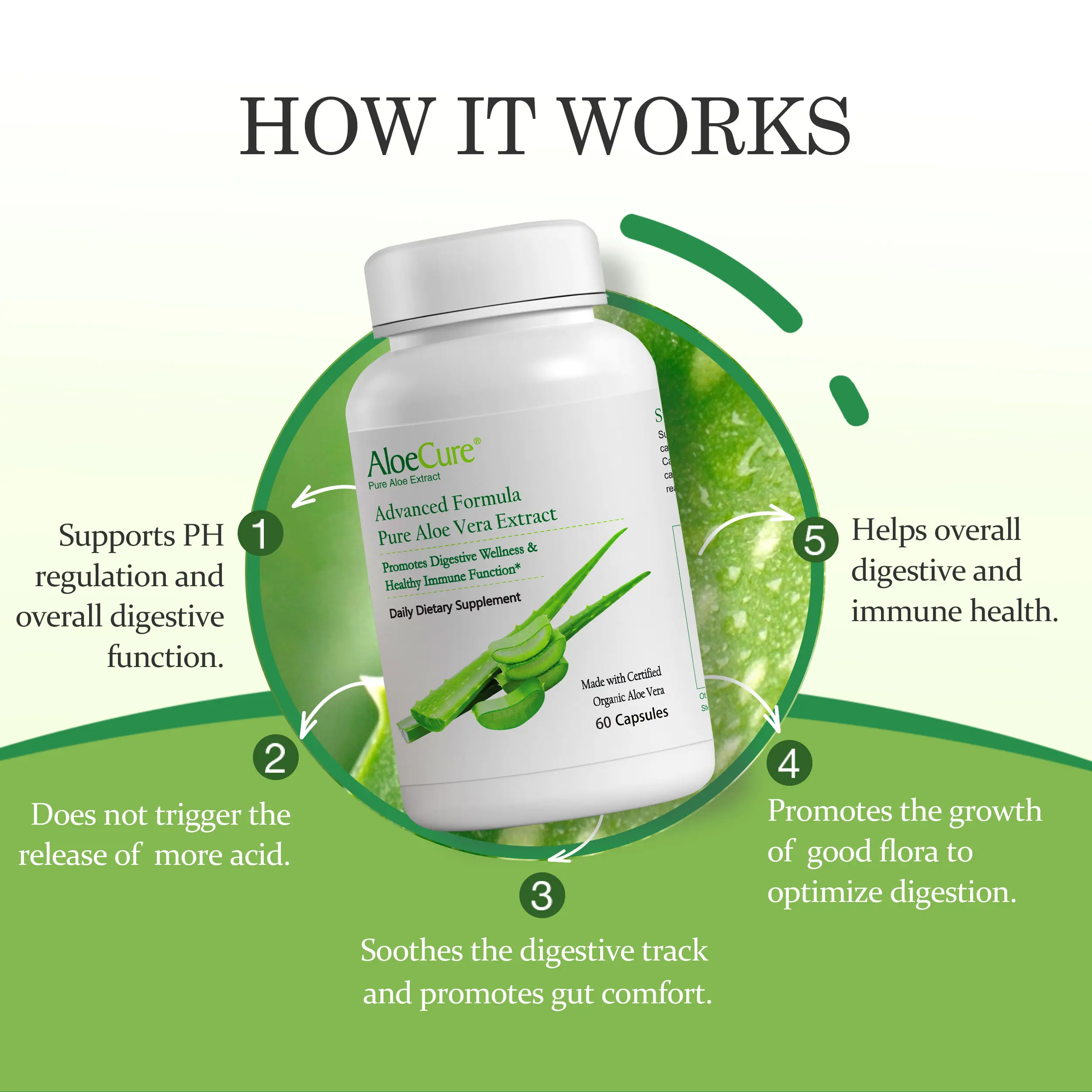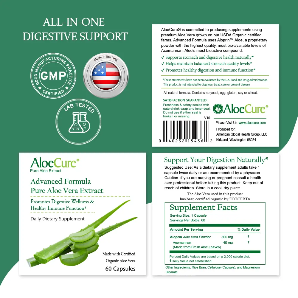 Restore harmony and support optimal digestion with AloeCure Organic Aloe Vera Capsules!