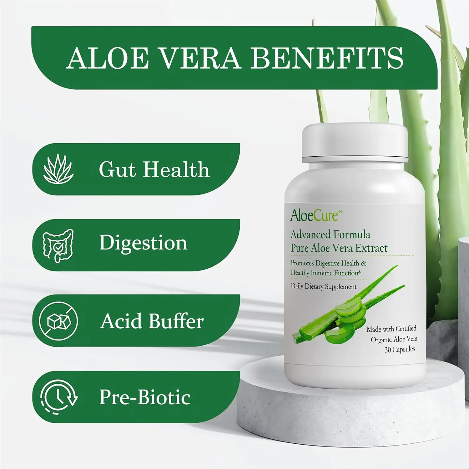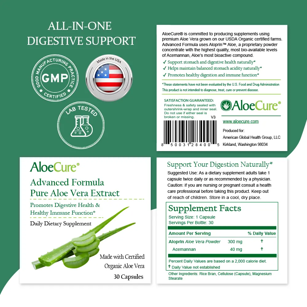 Restore harmony and support optimal digestion with AloeCure Organic Aloe Vera Capsules!
