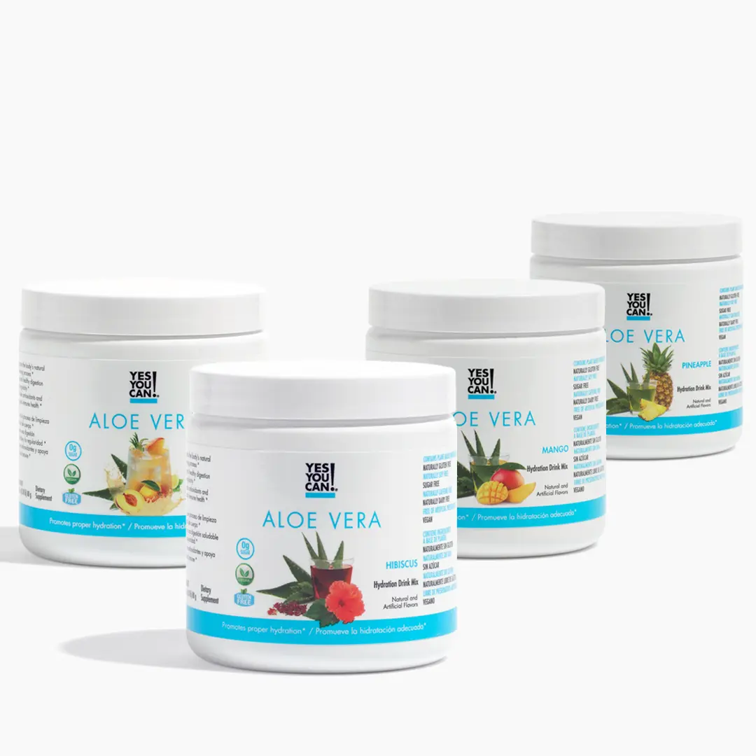 Introducing the Aloe Vera Hydration Solution that comes with the 4 thirst quenching drink mixes and a FREE motivational water bottle with a time marker to help you reach your hydration goals. Best part? Sugar Free & Caffeine Free with delicious tropical flavors!