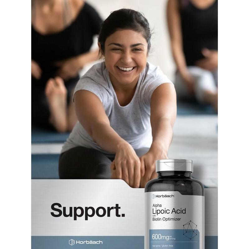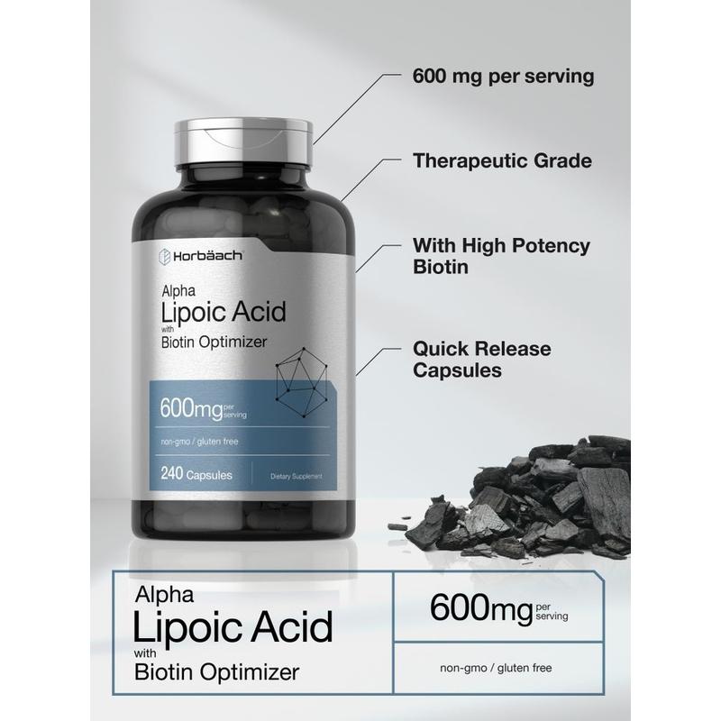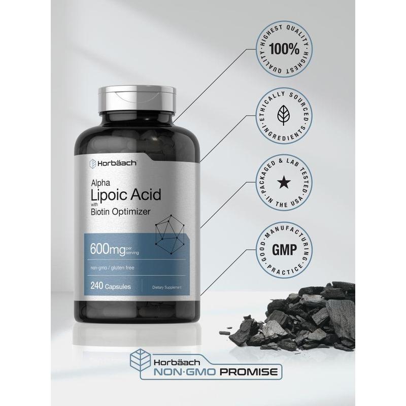Horbaach Alpha Lipoic Acid delivers 600 mg of ALA enhanced with a 999 mcg Biotin optimizer per serving in quick-release capsules. Our formula is gluten-free and non-GMO, with no artificial flavor, artificial sweetener, or preservatives. It's lab-tested for purity and potency to match our elite standards of quality. Get exceptional nutritional care at the value you deserve with Horbaach supplements!
