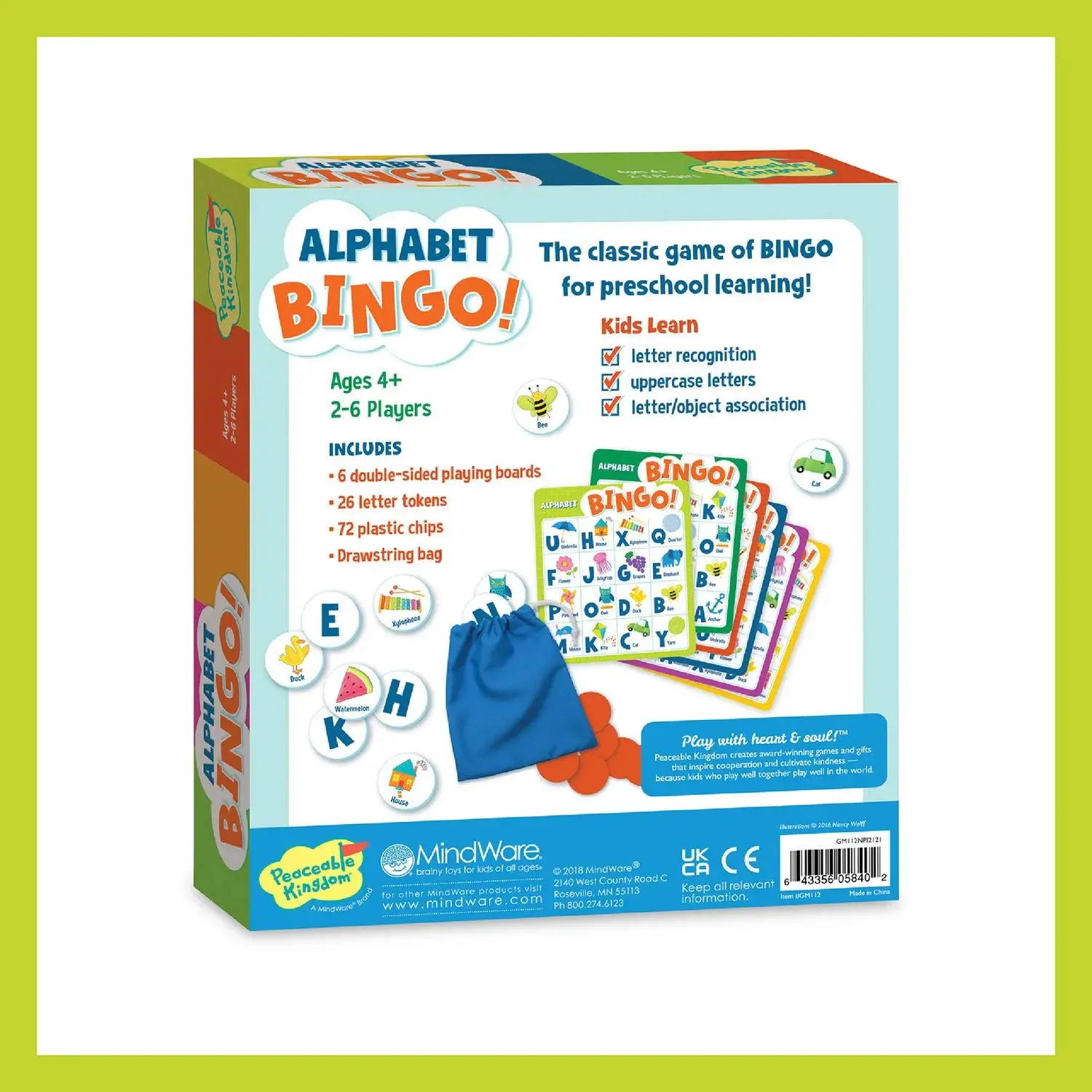 The Alphabet Bingo Peaceable Kingdom Board Game offers a delightful twist on the classic bingo game, designed to help young learners practice letter recognition and phonics skills. Ideal for children aged 4 and up, this engaging game includes six double-sided boards, 26 letter tokens, 72 chips, and a drawstring bag. With instructions featuring eight different game variations, it provides a versatile and fun learning experience suitable for both home and classroom settings.