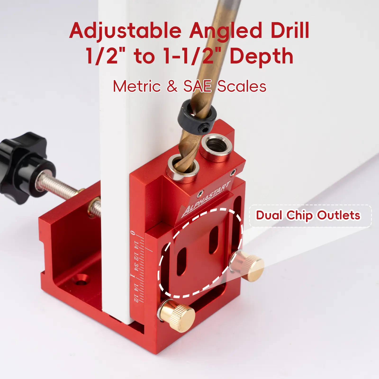 Laser-engraved measurement scales and a toothed height-lock system allow fast, precise adjustments. The secure locking mechanism prevents slipping or dropping during drilling, ensuring reliable accuracy.