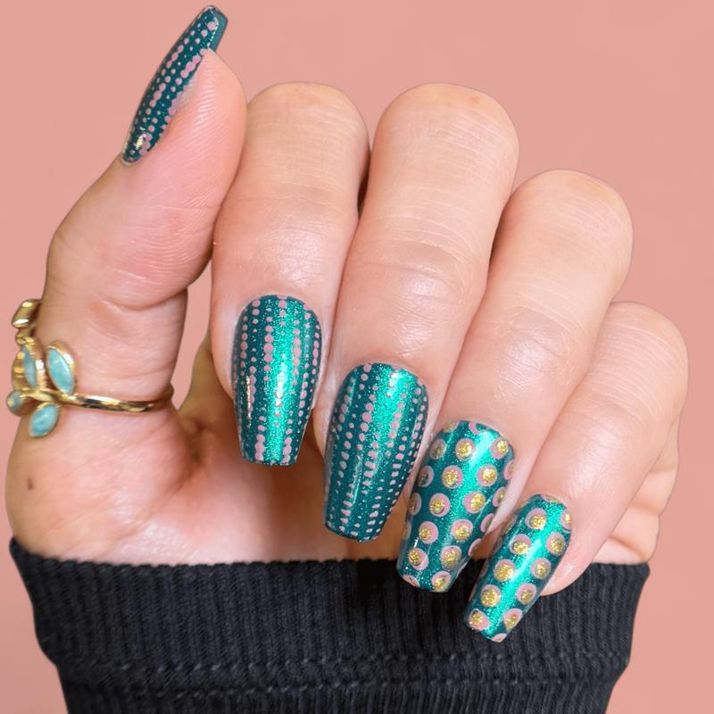 All-over patterns for those who want edge! Our Alt Aesthetic stamping plate packs bold geometric lines, checkered patterns, contrast circles, sharp squares, diagonal bars, stacked flowers, and optical illusions. Every design is full-coverage, ready to dominate the whole nail. You get high visual impact when you stamp with contrasting colors like black and white or mix matte with gloss finishes for extra depth. Play with contrasts and let your mani go all-out graphic!