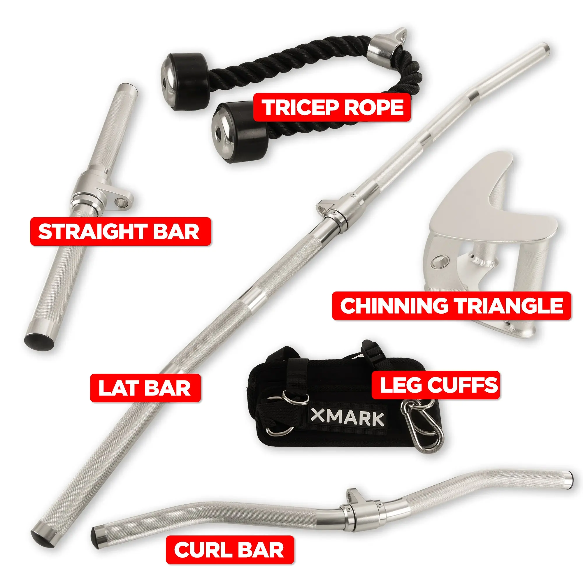 Complete Machine Attachment Set: Includes a Chinning Triangle, Revolving Seated Row, Sure-Grip Triceps Rope, Multi-Grip Revolving Curl Bar, Full-Size Lat Bar, and Ankle/Foot Strap for full-body cable training.