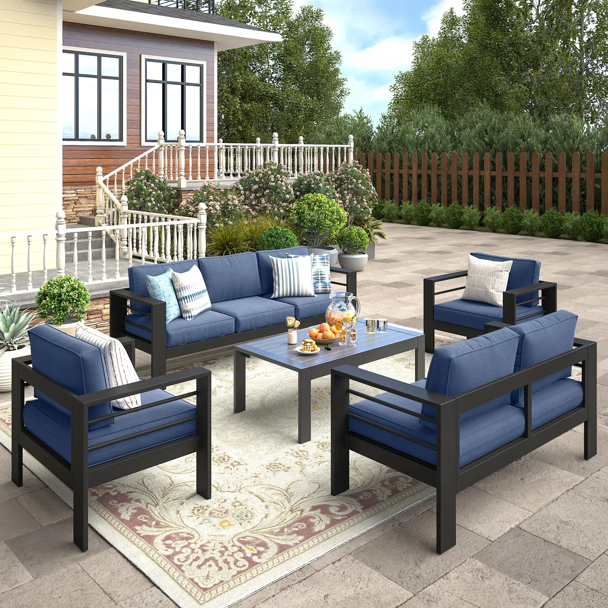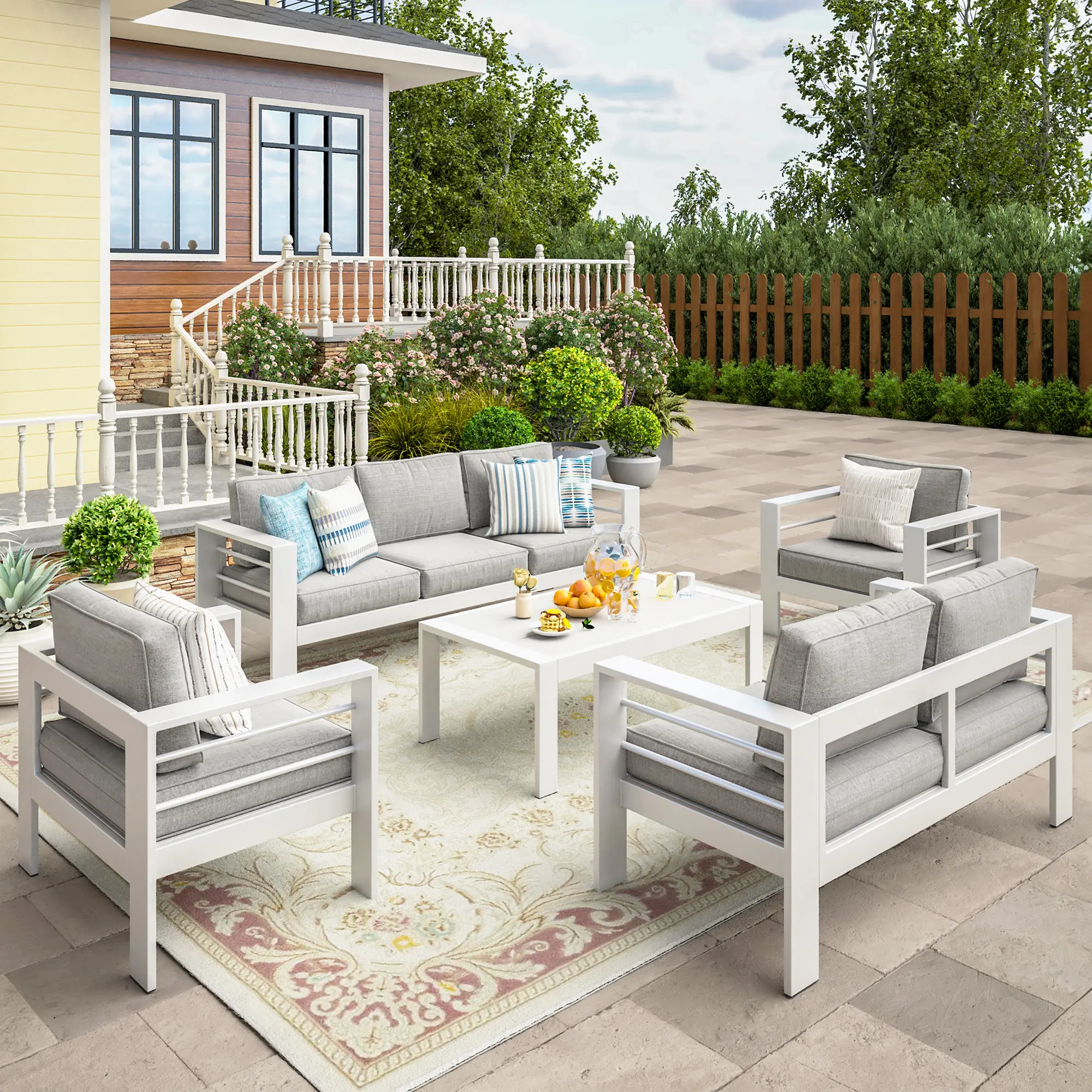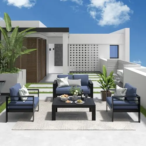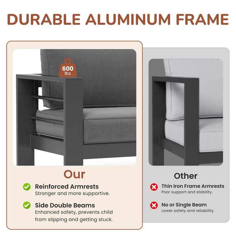 ·【Premium All-Aluminum Frame】This modern patio furniture set is made of a powder-coated aluminum frame that is both solid and durable while being lightweight. Unlike traditional iron/steel furniture, aluminum outdoor patio furniture is resistant to fading, rusting, and corrosion in all weather situations. It will serve you well for many years!