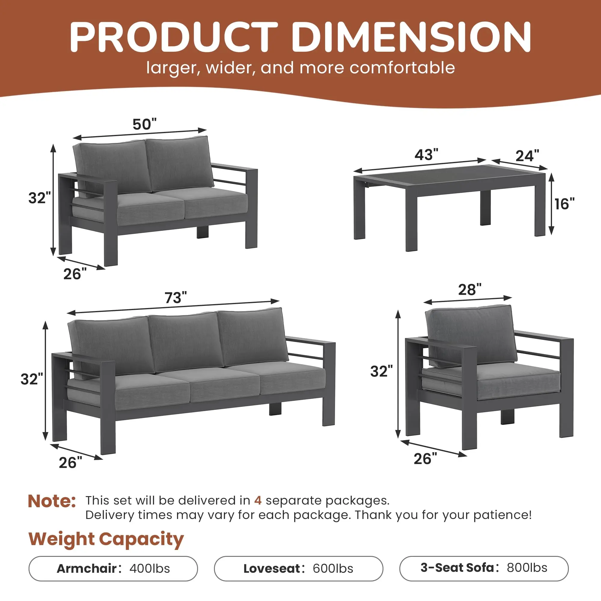 ·【Always Right by Your Side】RoyalCraft metal patio furniture sets come in 4 boxes. They may not arrive together. If you have any issues like missing parts or damage, please get in touch with us for assistance. Each package includes 1 x Three-seat Sofa, 2 x Armchairs, 1 x Loveseat, 1 x Coffee Table, a set of cushions, and an instruction manual. Enjoy the outdoors with RoyalCraft !