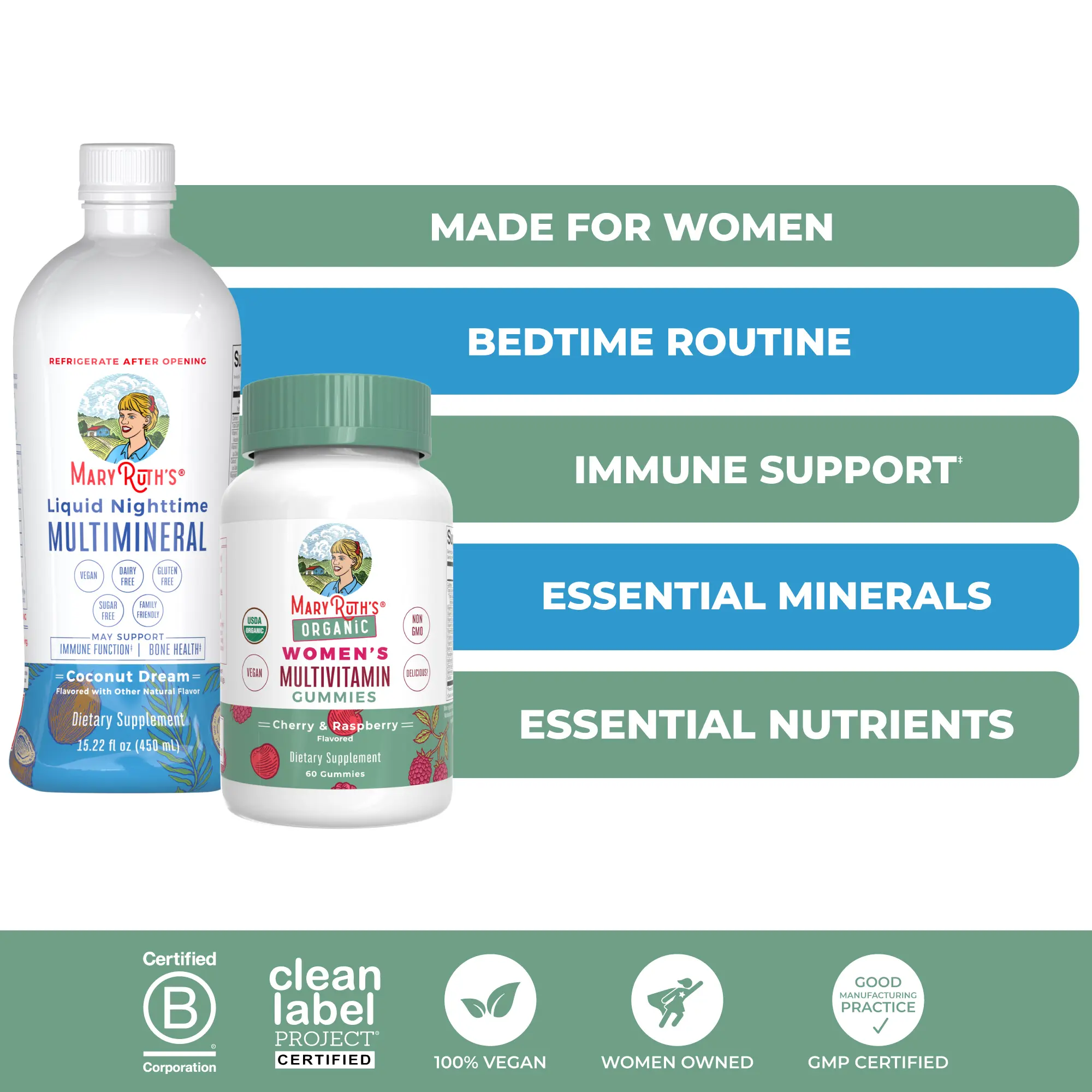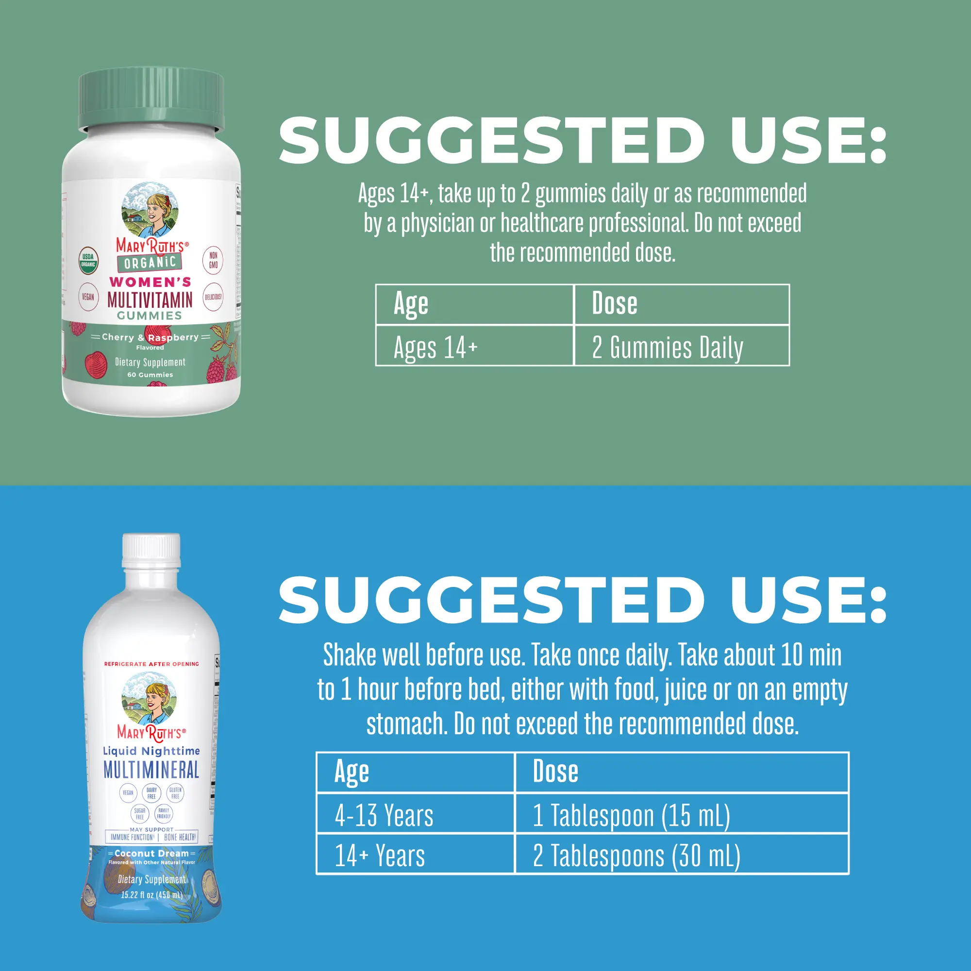 Our delicious cherry & raspberry flavored Organic Women's Multivitamin Gummies support healthy vision, skin, and more, while our Liquid Nighttime Multimineral supports your body with nourishing nutrients while you rest!