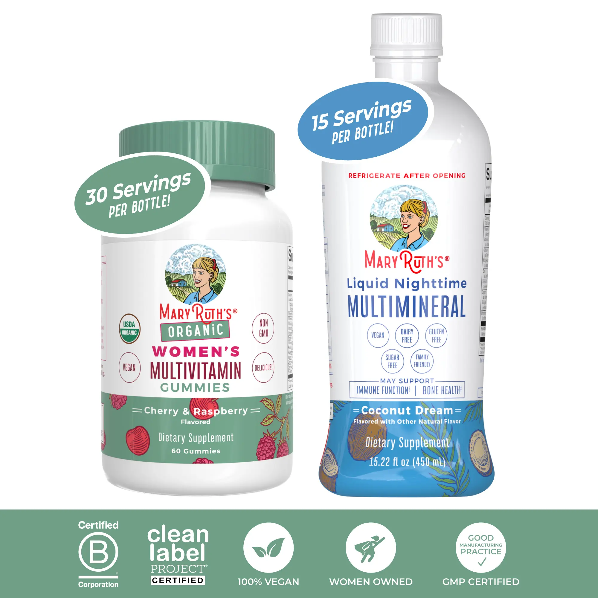 Support women's daily nutrient needs during the day as well as mineral levels at night with this bundle of our organic multivitamin gummies for women and your choice of coconut, pineapple, or cranberry-flavored multimineral!