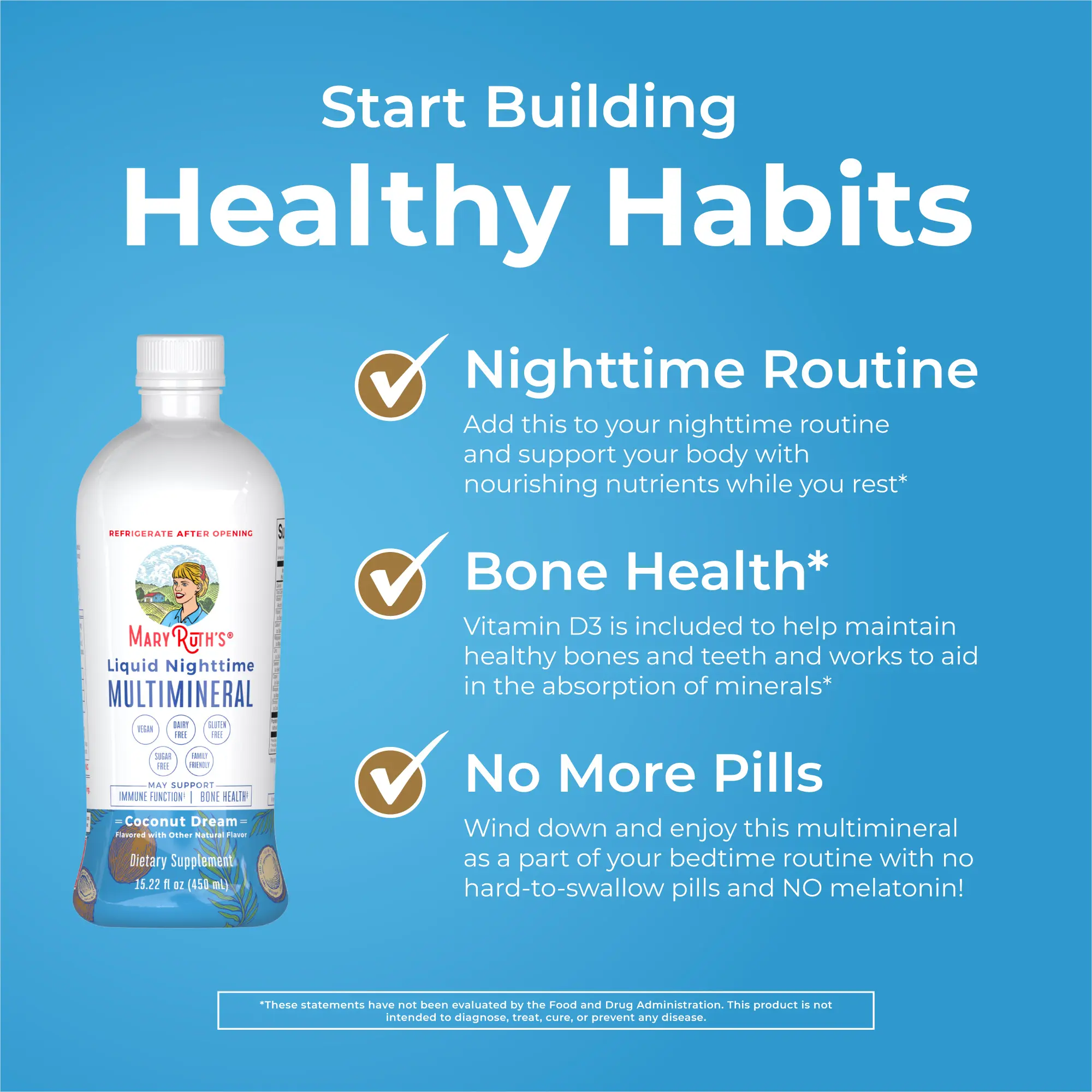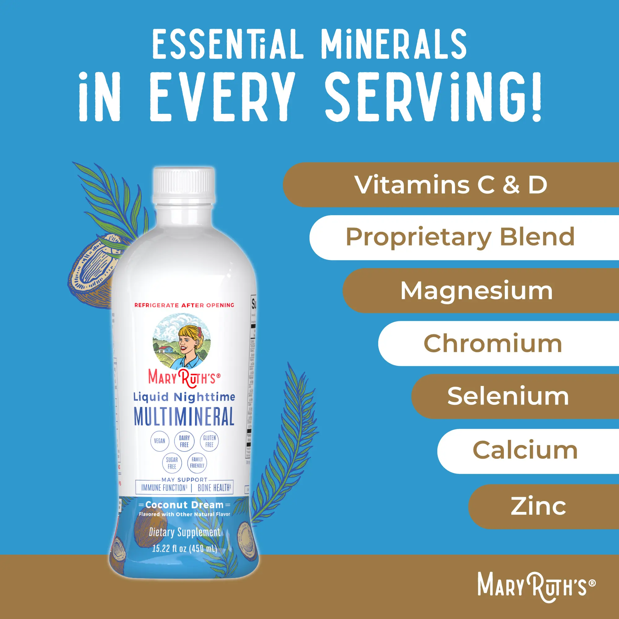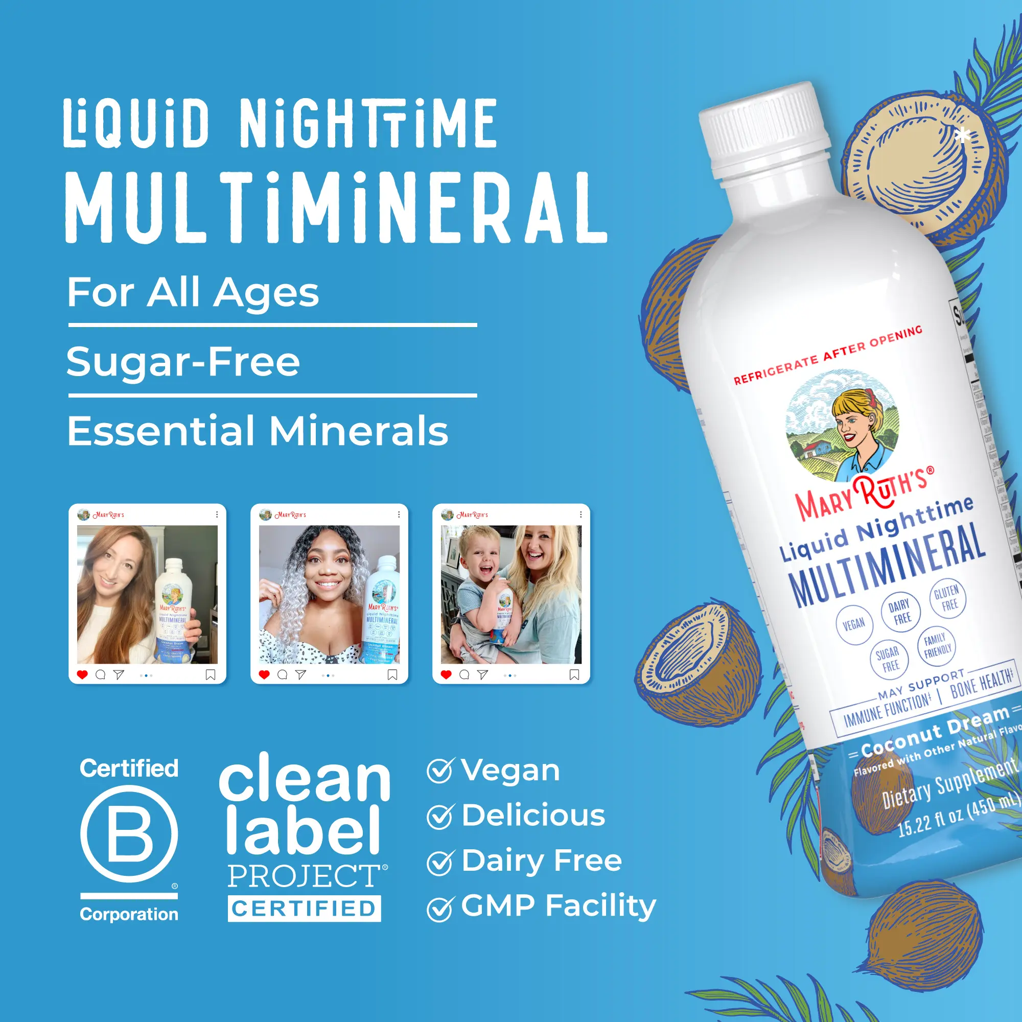 For Most Lifestyles: MaryRuth's Liquid Nighttime Multimineral is Non-GMO, Vegan, Made in a GMP Facility. Melatonin Free, Dairy Free, Gluten Free, Sugar Free. Formulated for Adults and Kids. Third Party Tested. Clean Label Project Certified. B Corp Certified.