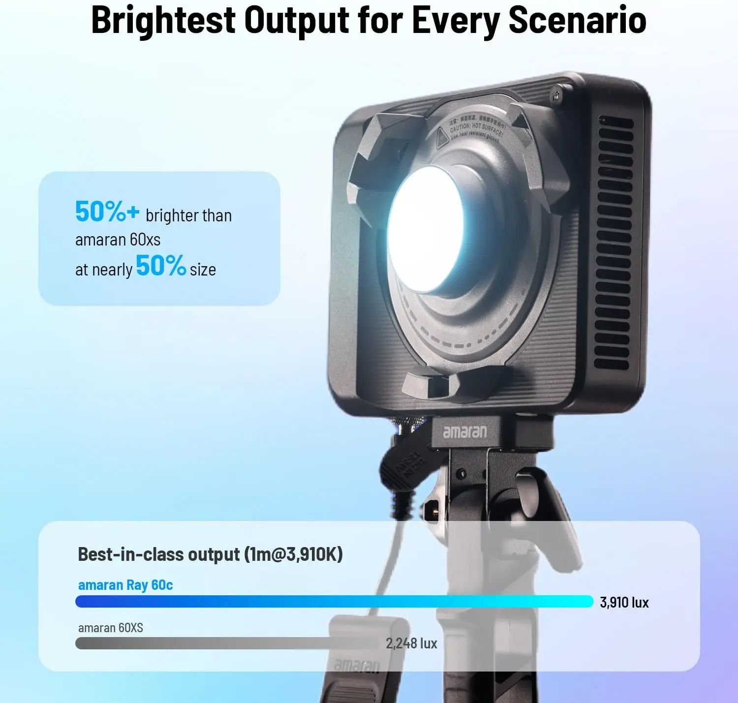 ·Best-in-class brightness: The amaran Ray 60c outshines competing ultra-compact COB lights, delivering up to 3,910 lux at 1m without accessories – over 50% increase in output vs. the amaran COB 60x S – while being nearly half the size1. Or pair with the optional Mini Reflector or Mini Fresnel for even more punch