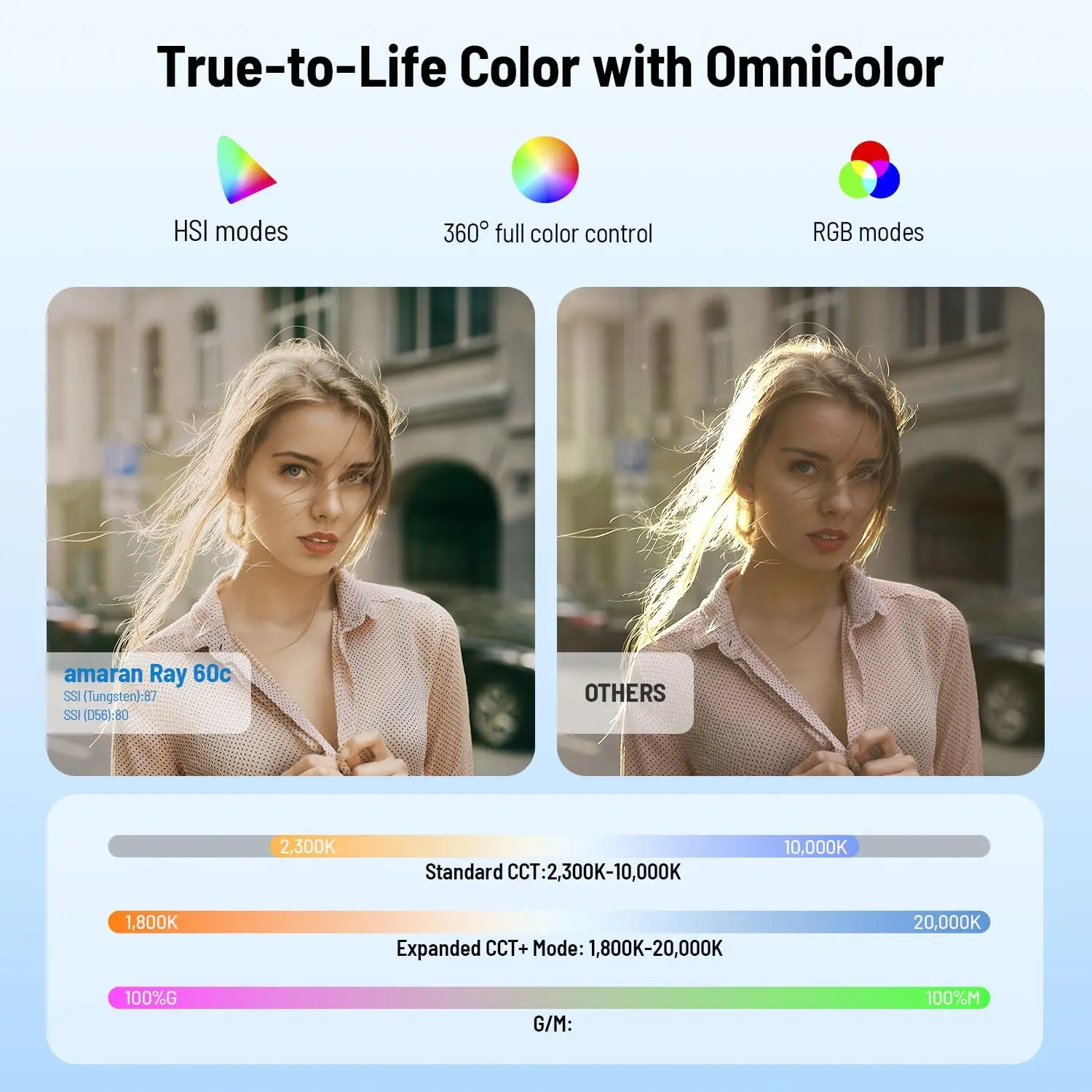 ·True-to-life color with OmniColor: Powered by the OmniColor light engine, the amaran Ray 60c reproduces light that looks true-to-life – both on camera and to the eye. Building on amaran’s previous full-color chipset, OmniColor expands the red and blue ranges to deliver a fuller, more balanced spectrum of light – achieving SSI scores of 87 (Tungsten) and 80 (D56). What you see is what you capture: cleaner whites, truer skin tones, and more accurate color that stays consistent on camera