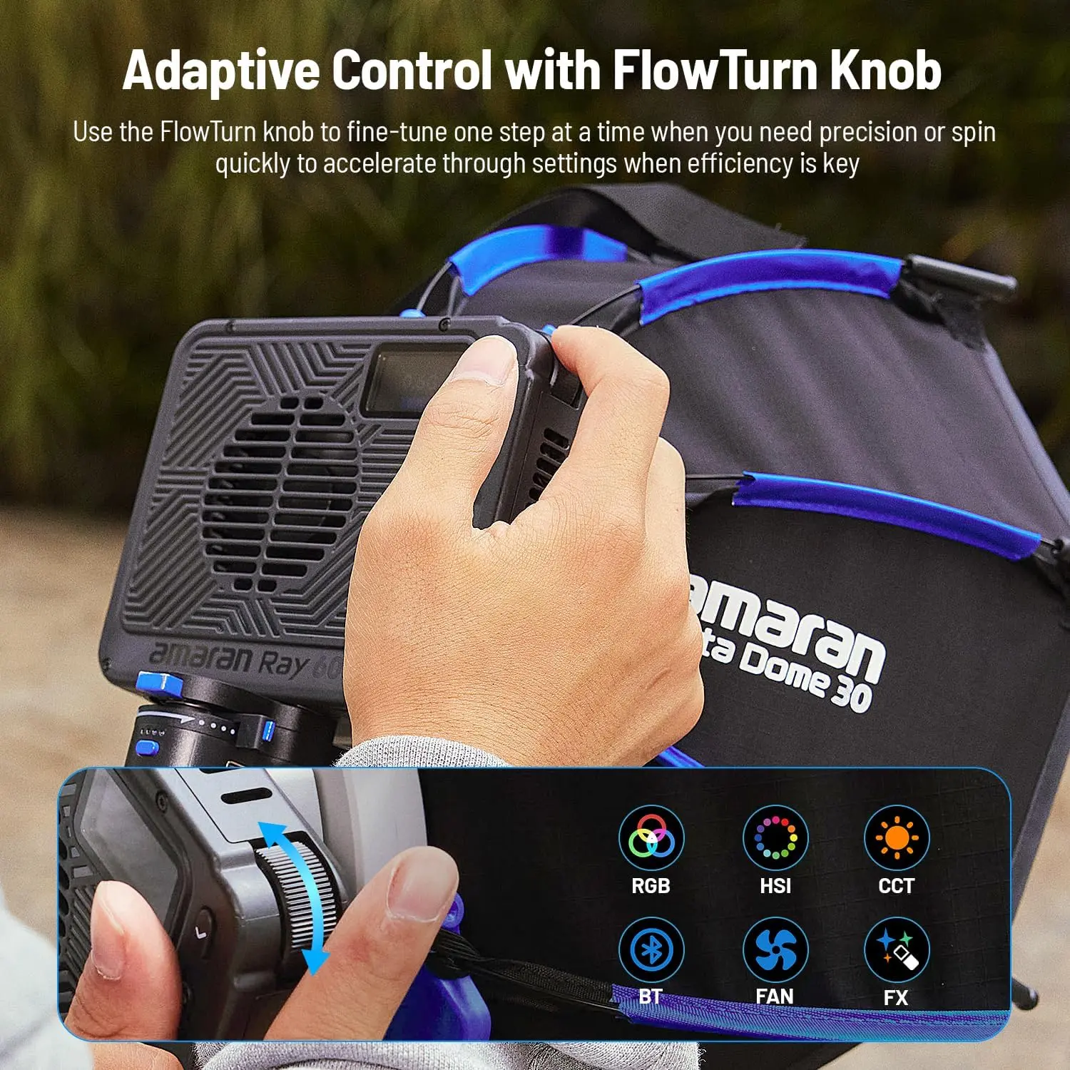 ·Instant, effortless controls: The amaran Ray 60c is built to make setup and adjustments faster and more intuitive. Use the FlowTurn knob to fine-tune one step at a time when you need precision or spin quickly to accelerate through settings when efficiency is key. In the amaran app, pair your amaran Ray 60c or multiple lights in the Ray family with just a tap via built-in NFC – even before turning it on