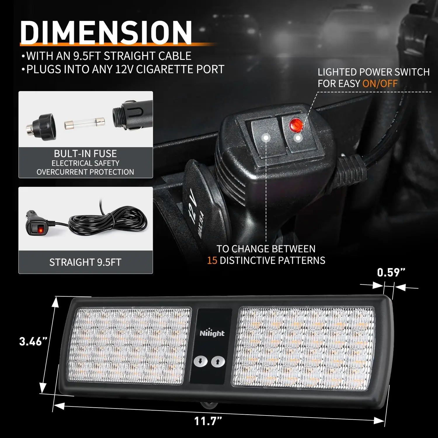 ·Wire length of light :9.5FT; Strobe Patterns: 15; Lifespan: Over 50,000 Hrs.