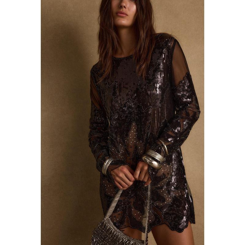 The perfect RSVP-yes dress, the Amber Nights Black Beaded Mini Dress. A sheer long sleeve mini with sequin detailing all over. Style it with the Norma Black Strapless Under Dress if you are looking for more coverage.STYLE RECOMMENDATIONS:- Complete the look with the Norma Black Strapless Under DressPRODUCT DESCRIPTION AND MATERIALS:- black long sleeve mini dress- sheer material - slip not included- black sequins all over - sheer long sleeves with floral sequin print- button and look closure at back of neck- 100% polyester - hand wash cold with like colors - do not bleach - line dry - do not iron SIZE RECOMMENDATIONS:- runs true to size- measured on a size smallSmall: 2-4- length: 32.25”Medium: 6-8- length: 33.25" Large: 10-12- length: 34.25” MODEL DETAILS:- Ava is 5'5"- Bust: 33 B- Waist: 24.5"- Wearing size SmallRETURN POLICY:We offer refunds & exchanges within 15 days of delivery with tags attached & in original, unworn conditions (restrictions apply). We reserve the right to refuse returns & not honor refunds on items that have been worn, stained/soiled, laundered or altered in any way. This includes such marks as bodily fluids, deodorant stains & removed/tampered with liners. For sanitary reasons, we ask that you try on items over underwear. All sale items are final sale. Final sale items are non-returnable and non-exchange. Final sale items include: jewelry, accessories, sale marked items, sale swim, and vintage garments.