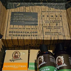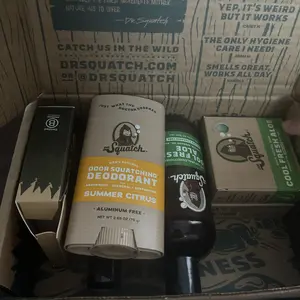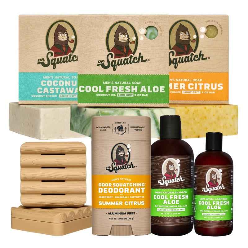 Have a fresh, clean summer with this outdoor inspired head-to-toe American Summer bundle. Featuring Summer Citrus, Coconut Castaway, and Cool Fresh Aloe scents - this 6 pack consists of 3 bars of soap, 1 deodorant, 1 shampoo, and 1 conditioner for a full shower routine. Hydrate that head of hair while staying fresh to death, just like a Squatch Man should be.