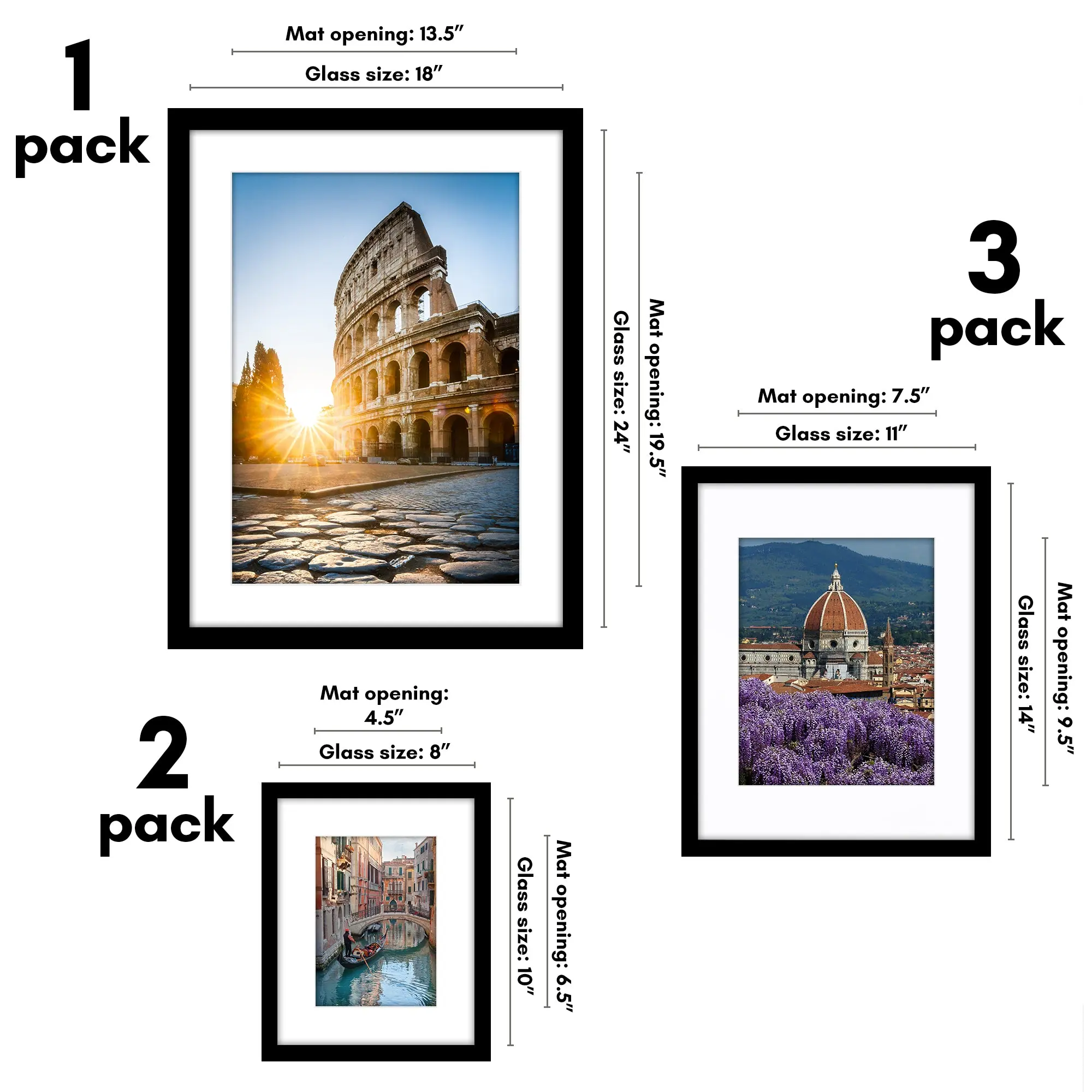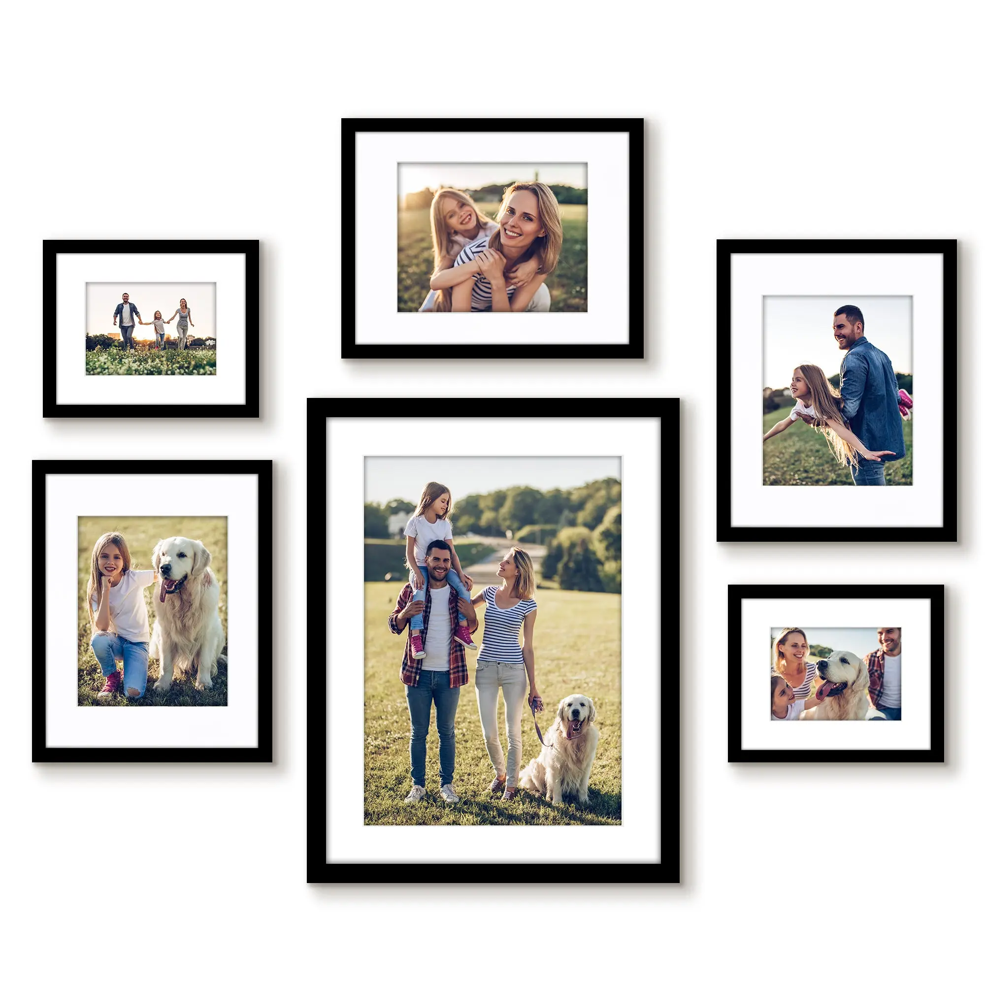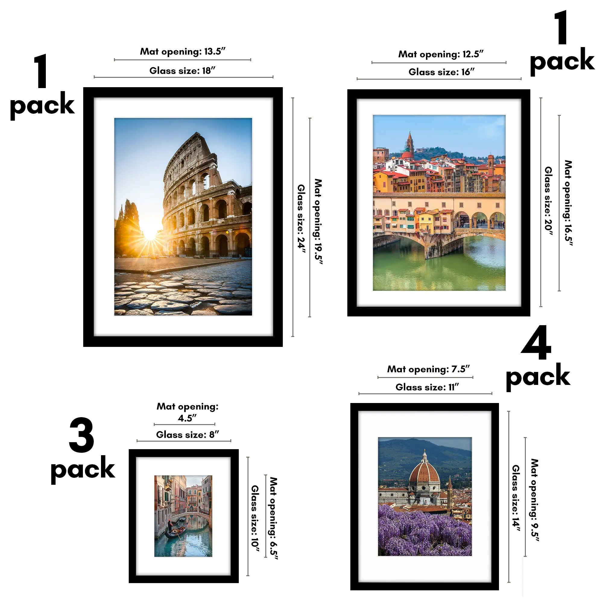 Build a cohesive gallery wall with this 6 or 9-piece black picture frame set. Designed for versatile home decor, the assortment fits popular photo and poster sizes, with white mats and shatter-resistant glass fronts. Actual mat opening is 0.5 inches smaller. For crisp presentation of images, prints, and wall art. Helping you plan layout for a balanced, modern display in the living room, hallway, office, or entryway