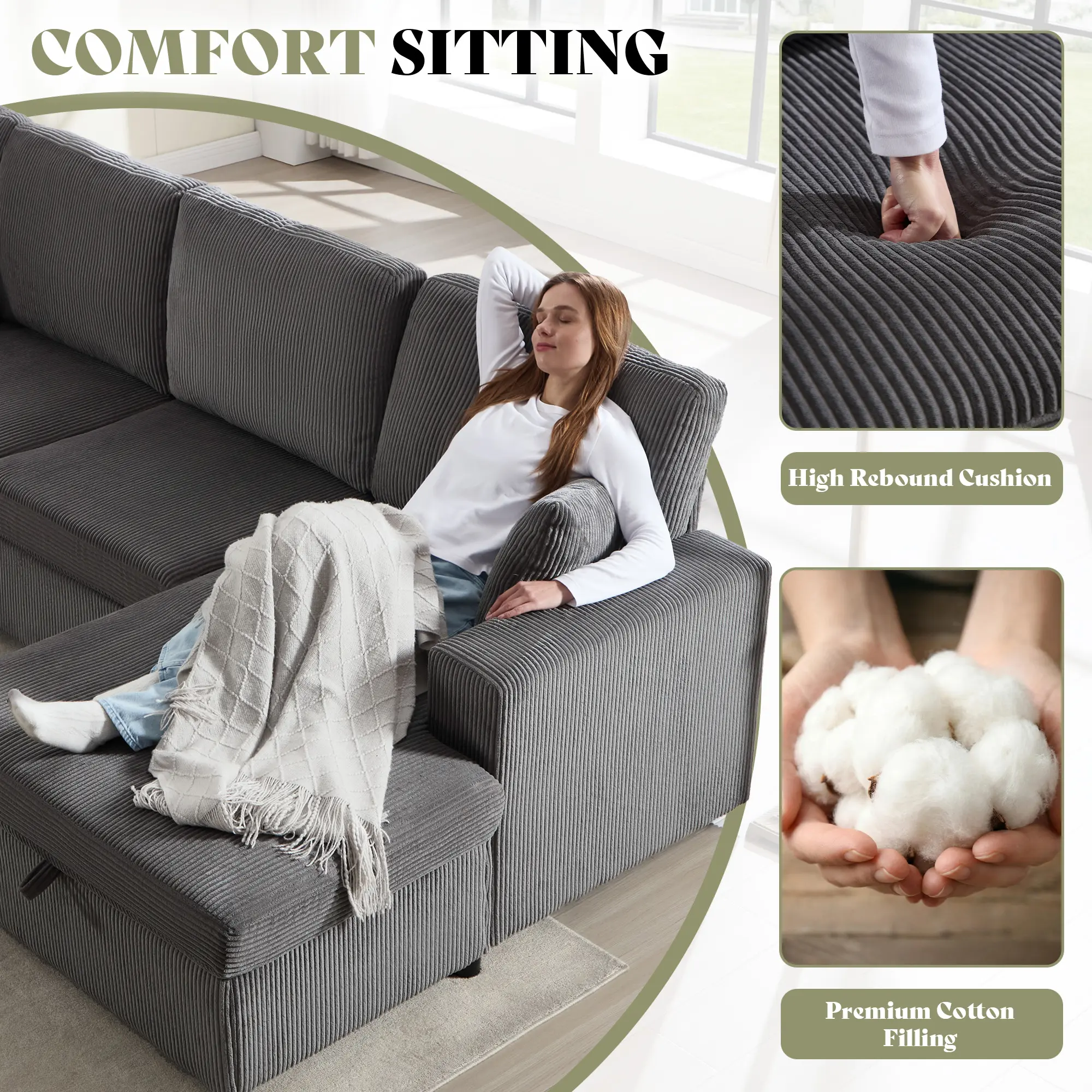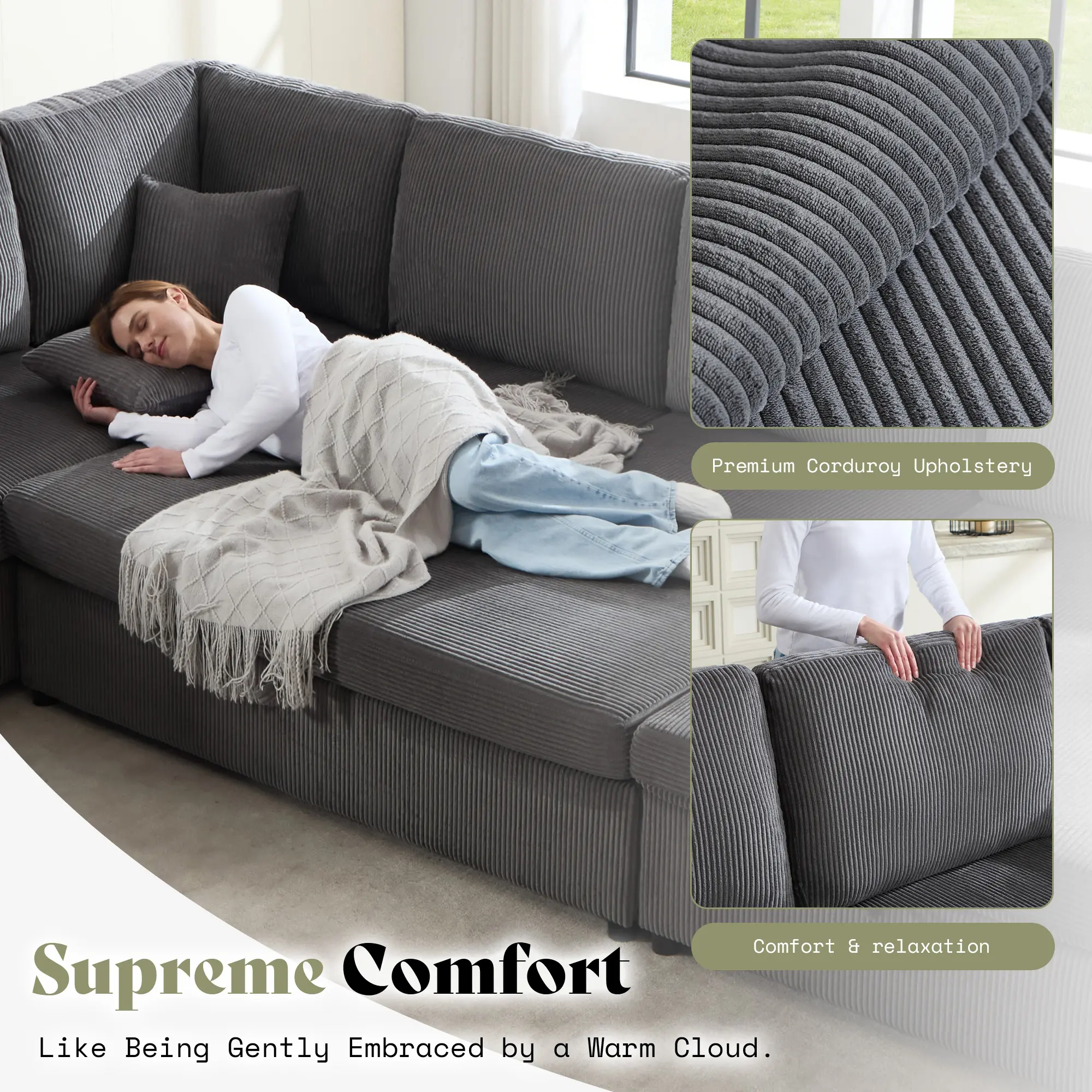 ·Cloud-Like Comfort: Sink into this cloud couch sectional! 7cm of high-resiliency foam & cotton filling molds to your shape, wrapped in soft corduroy for comfort that lasts. Pure relaxation awaits.