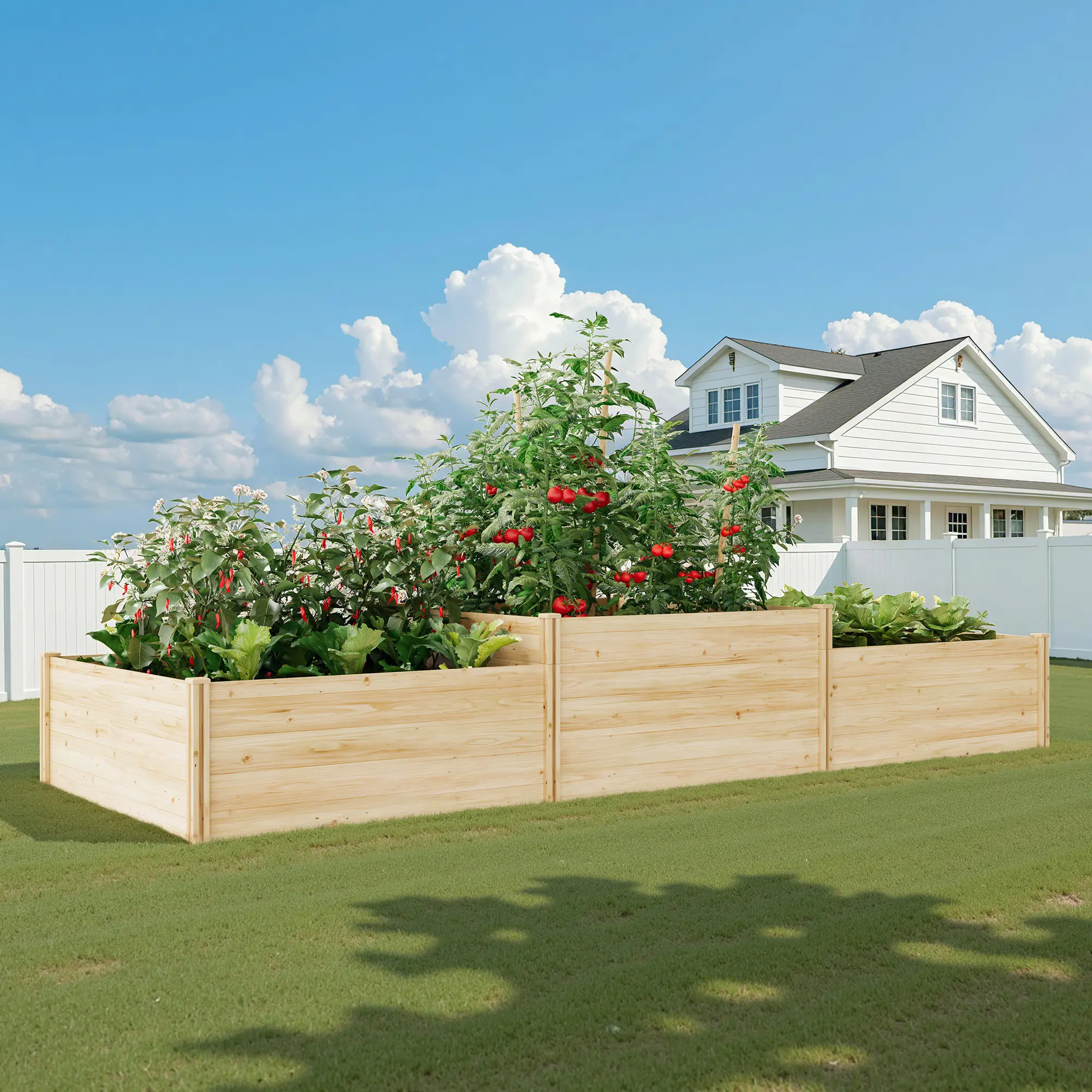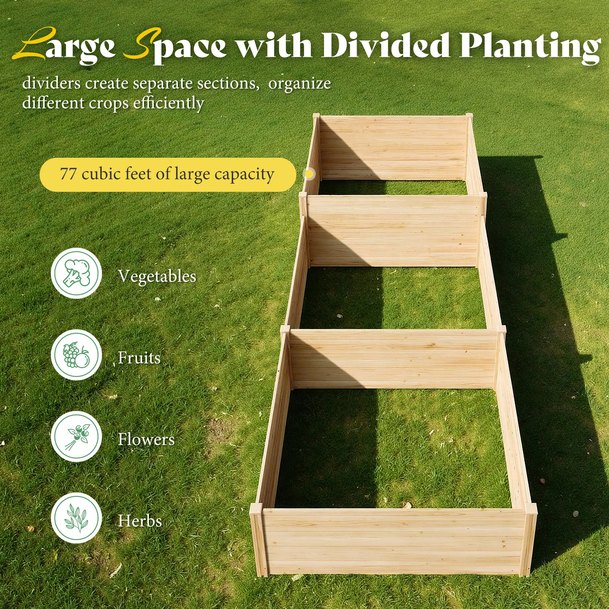 ·Zone Planting: The 3-section garden bed layout lets you separate crops by growth needs. The open-bottom design improves drainage, promotes healthier roots, and suits vegetables, herbs, and flowers