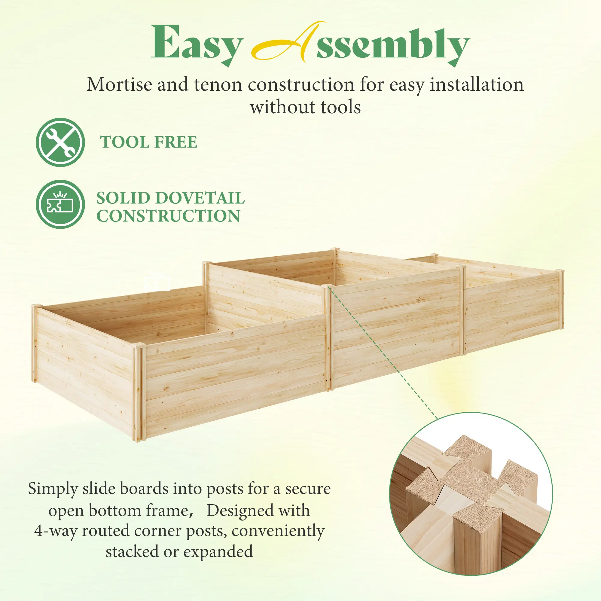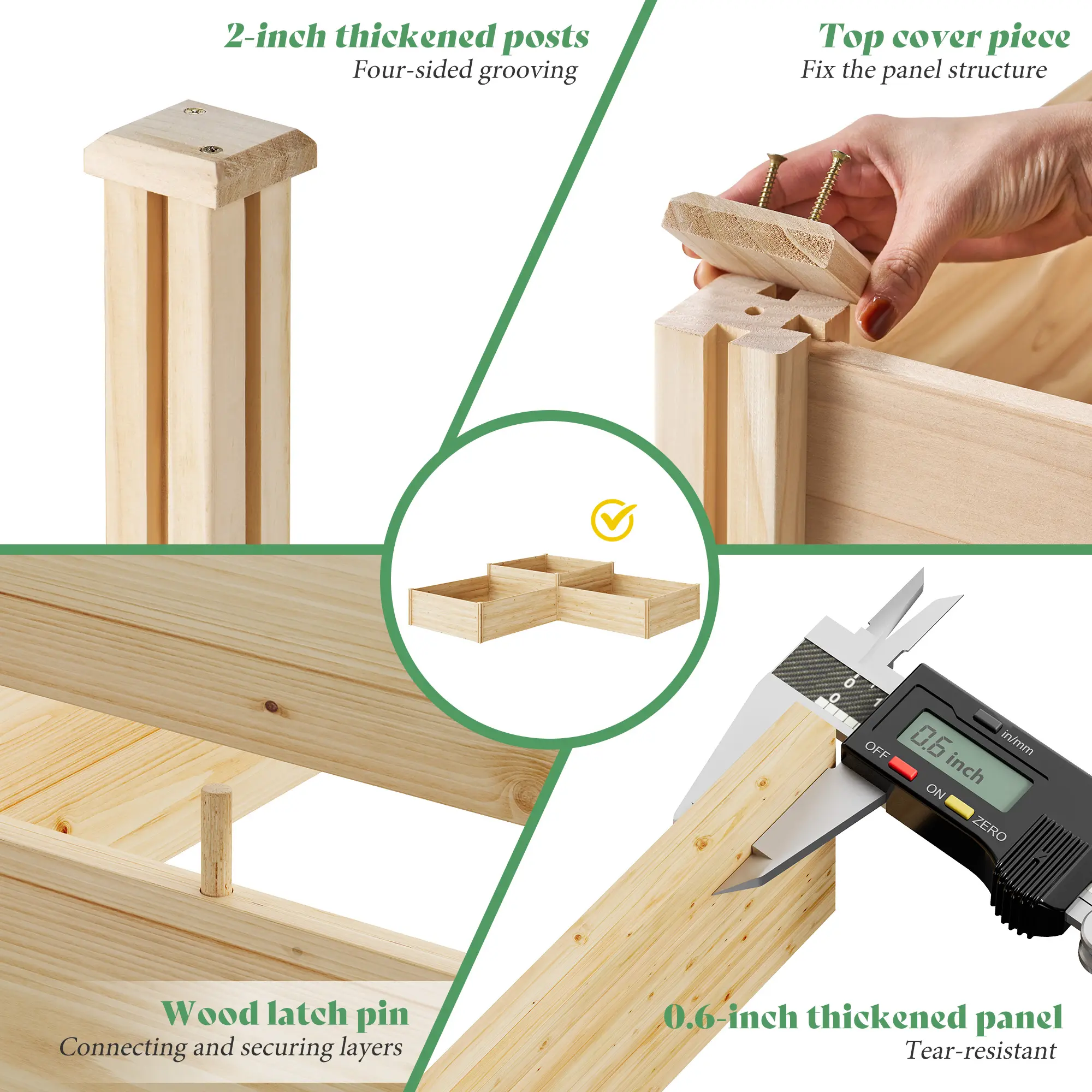 ·Stability and Design: Posts have four-side grooves that lock panels securely. Fir top caps fixed with screws add durability and give your raised garden beds outdoor a clean, refined finish