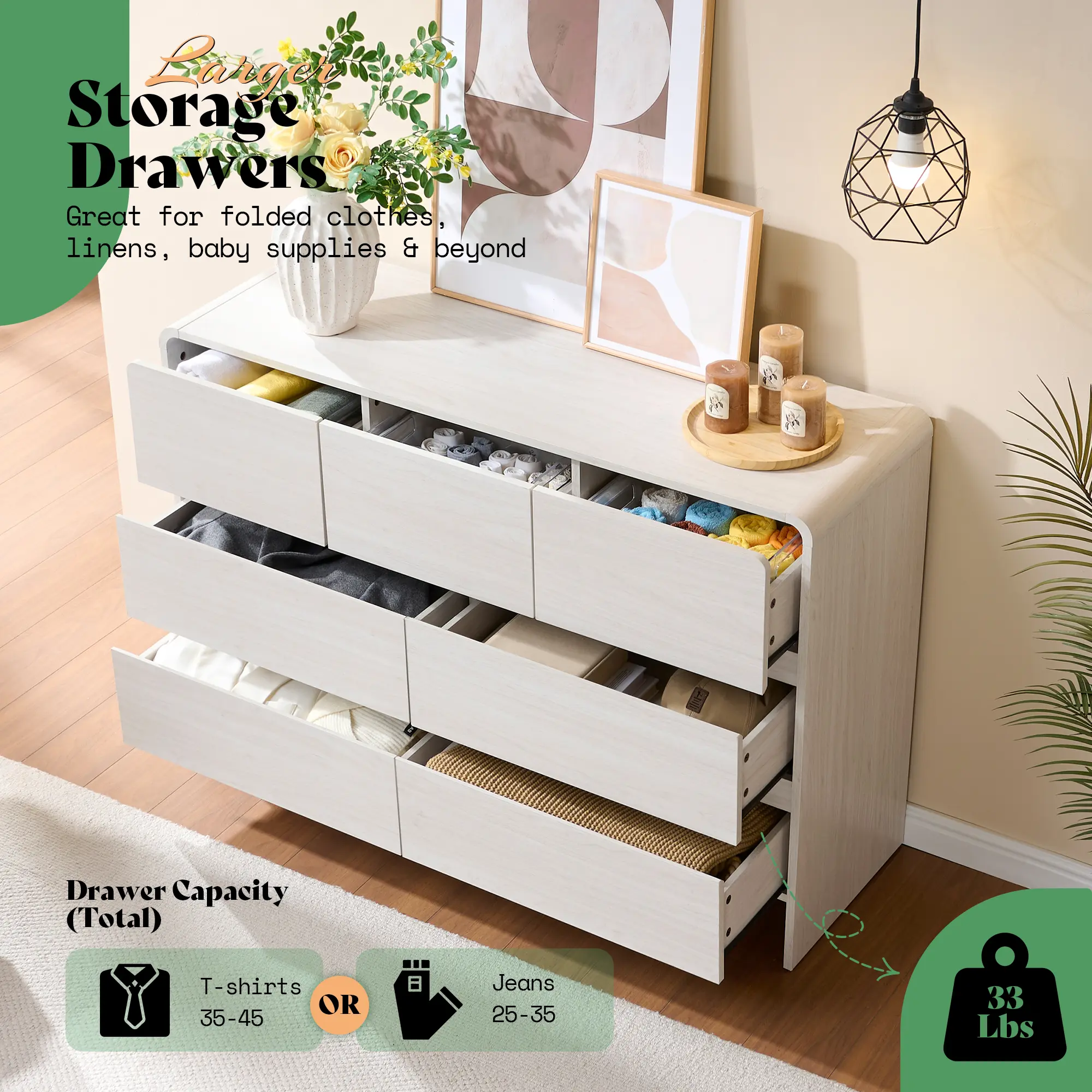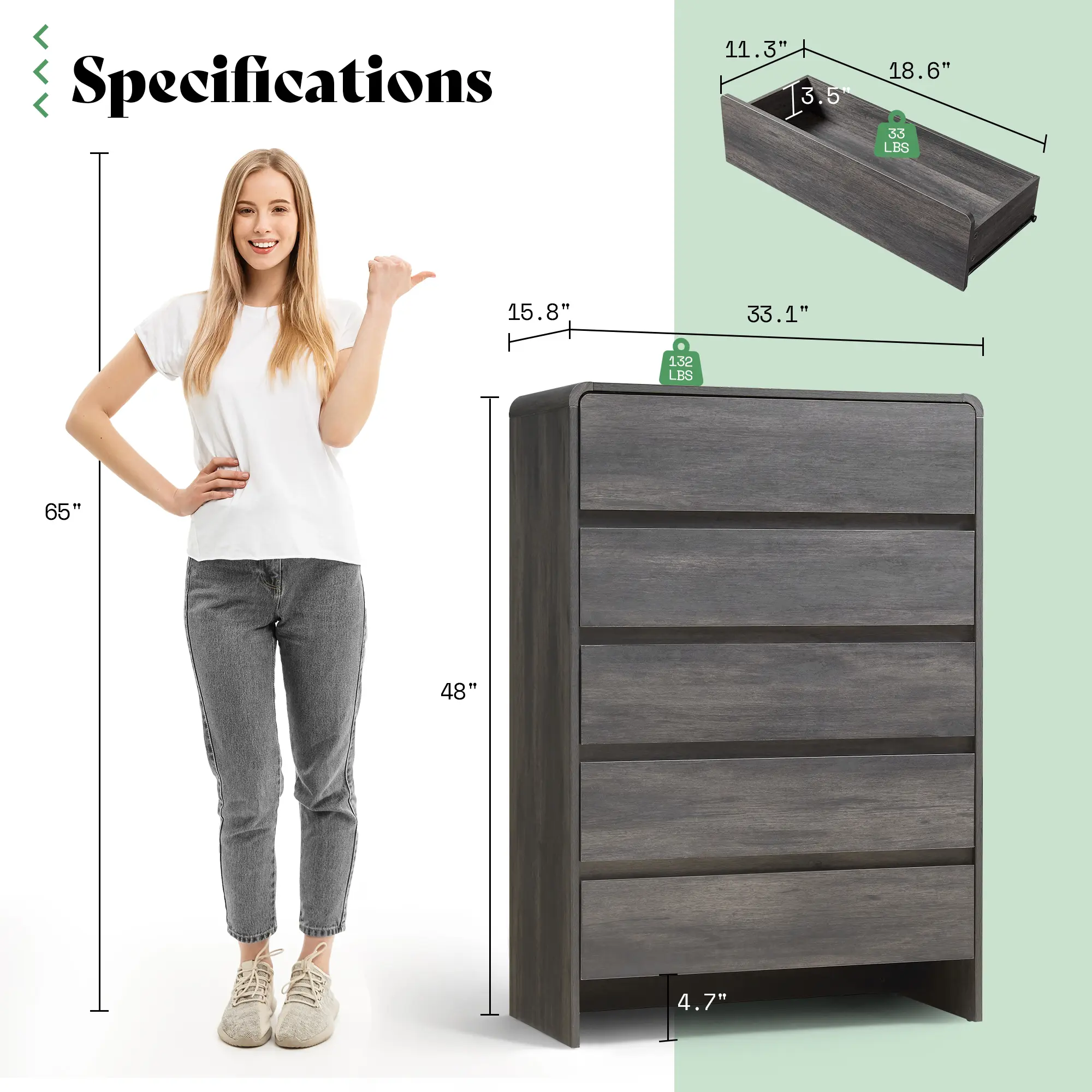 ·Spacious Drawers, Simplified Living: Taller, slimmer, and smarter. This 5-drawer dresser gives you ample storage without eating up your floor space. Each drawer spans nearly 30" wide and 11" deep—ideal for everything from bulky sweaters to your toddler’s toys.