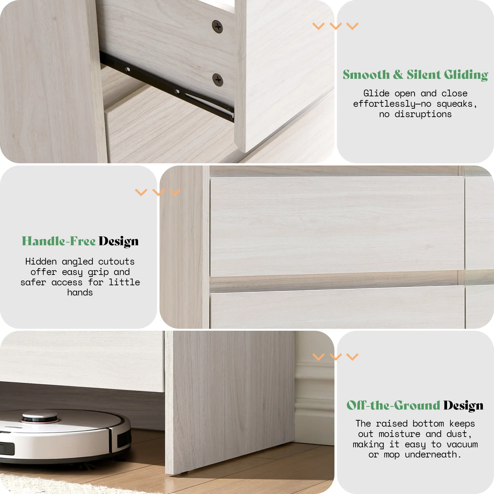 ·No knobs, No Hassle: This tall 5-drawer dresser uses hidden angled cutouts for each drawer—easy to grip, simple to use, and safer for little hands. Smooth-glide rails keep every open and close quiet and seamless, giving your room a clean, modern look that feels as calm as it looks.
