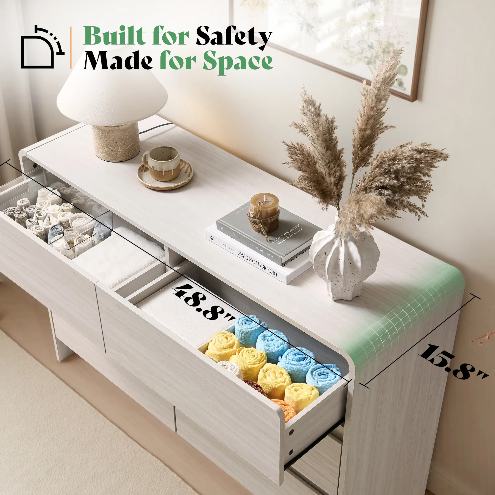 ·Safety First, For All Ages: From toddlers to seniors, this chest of drawers protect your family with metal rounded corners, and moisture-resistant surface and base. Peace of mind built in.