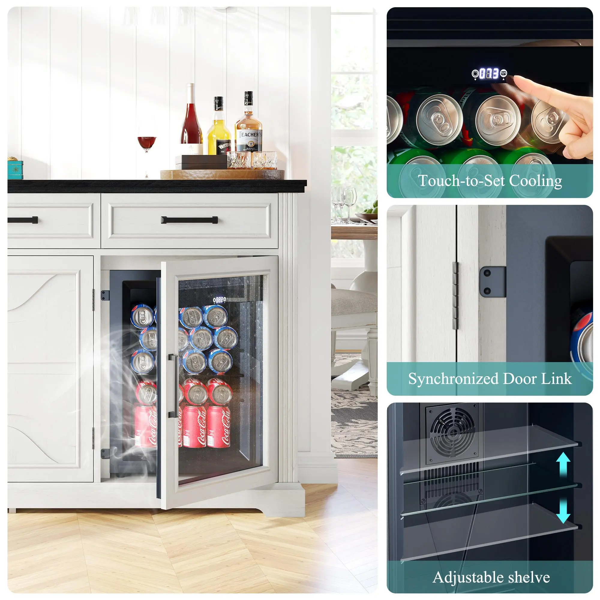 ·Built-In Beverage Fridge: Fridge and bar cabinet doors open as one for a seamless, built-in feel. Touch controls, energy-efficiency whisper-quiet, 24-can capacity, adjustable 41°F to 68°F temperature control cooling make it ideal for chills drinks, wine, preserves fruits.