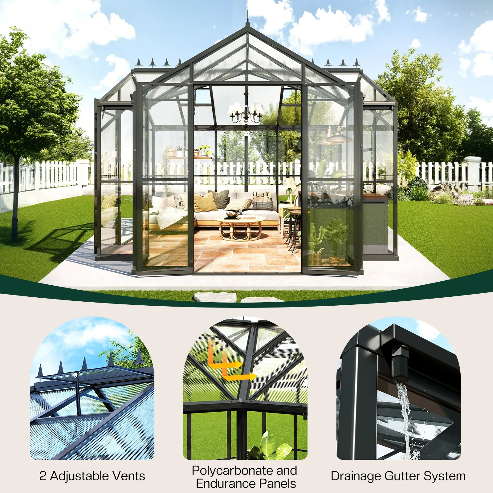 ·Dual Roof Vents & Drainage: Designed like a modern sunroom, it includes two adjustable vents and built-in drainage to improve airflow, regulate humidity, and prevent rainwater buildup