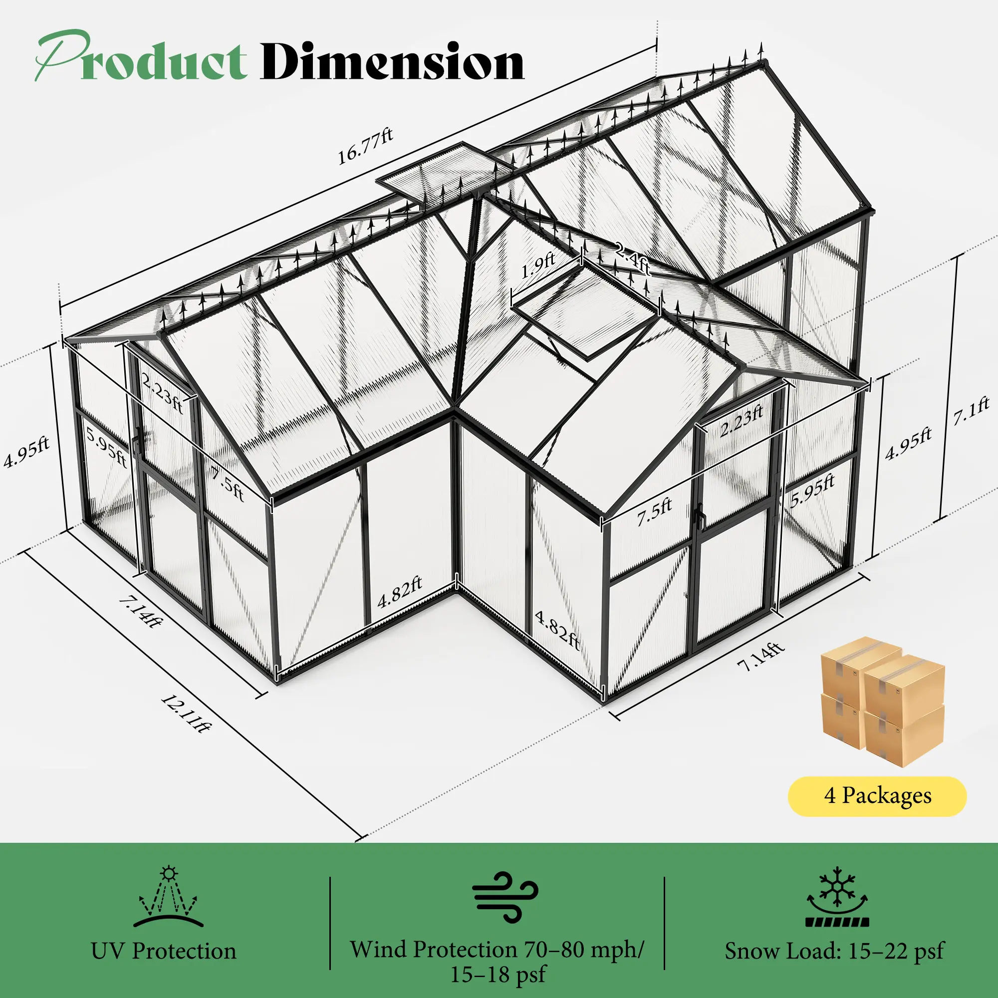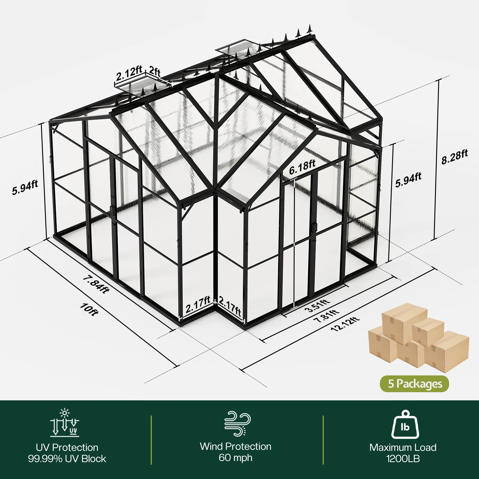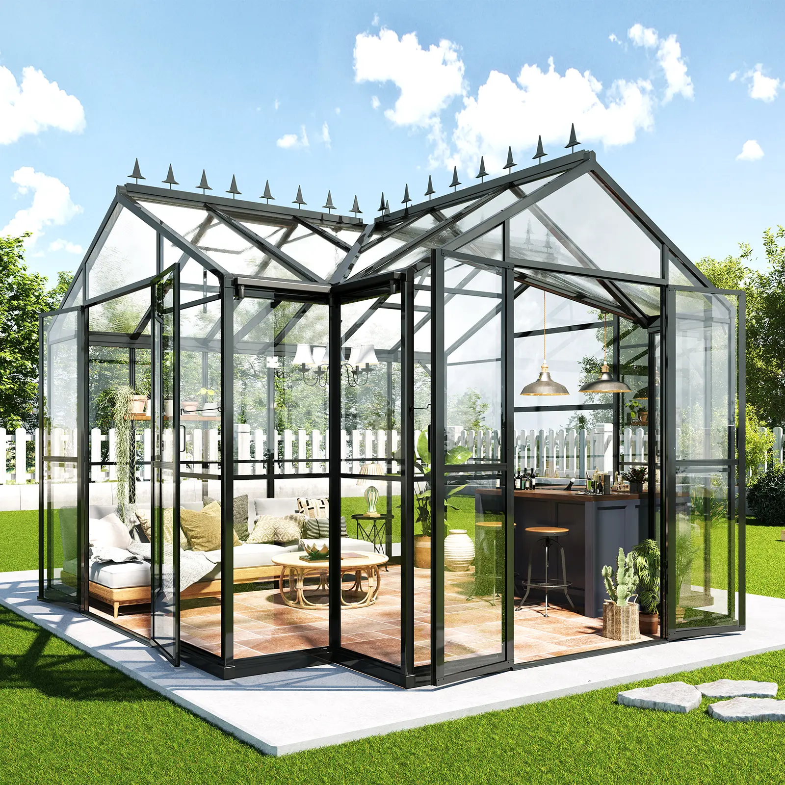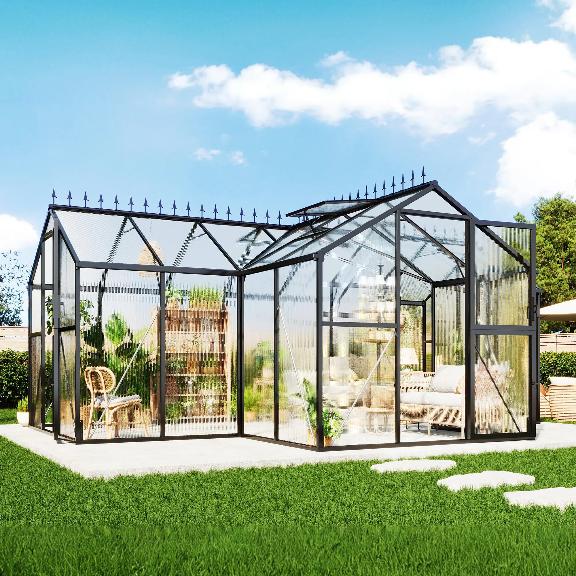 ·Elegant & Practical Design: UV-protected panels retain warmth and block rays, while the ridge cap prevents birds from perching—ideal greenhouses for outside year-round use