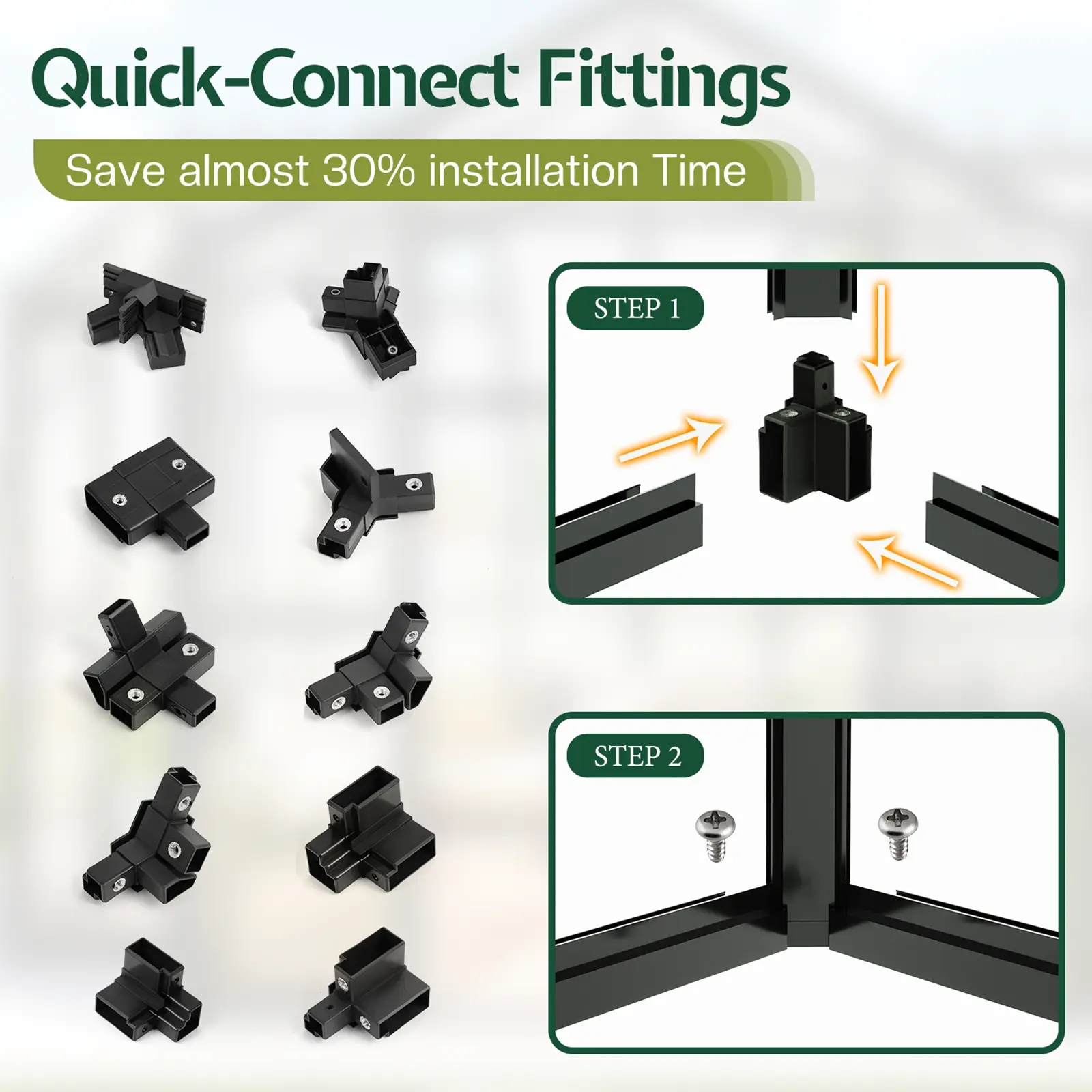 ·Quick-Connectors: The greenhouse kit features quick-connect adapters, 3 people can complete the setup in about 10 hours, significantly enhancing assembly efficiency.