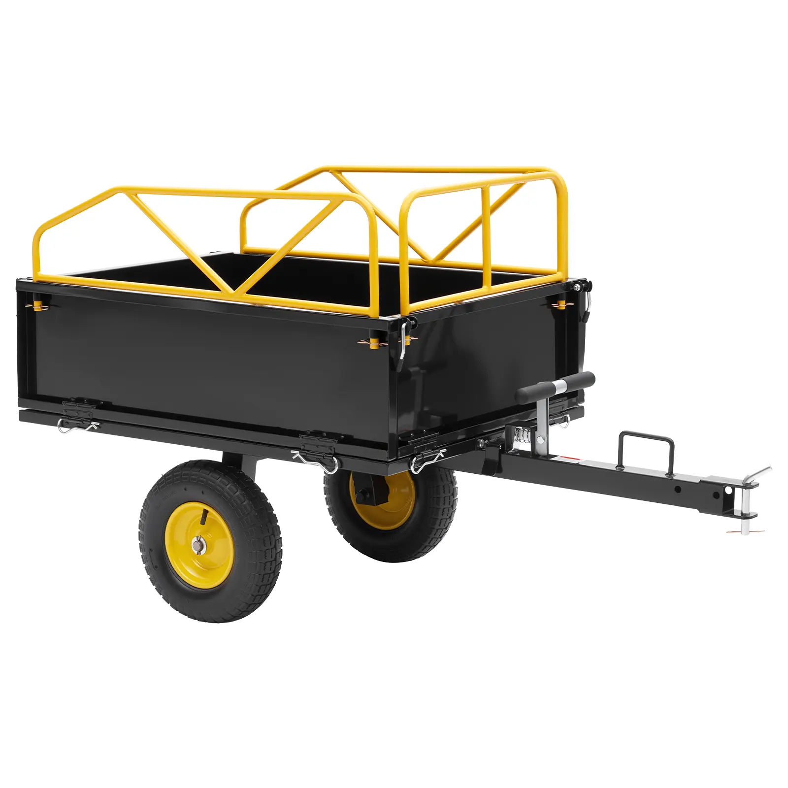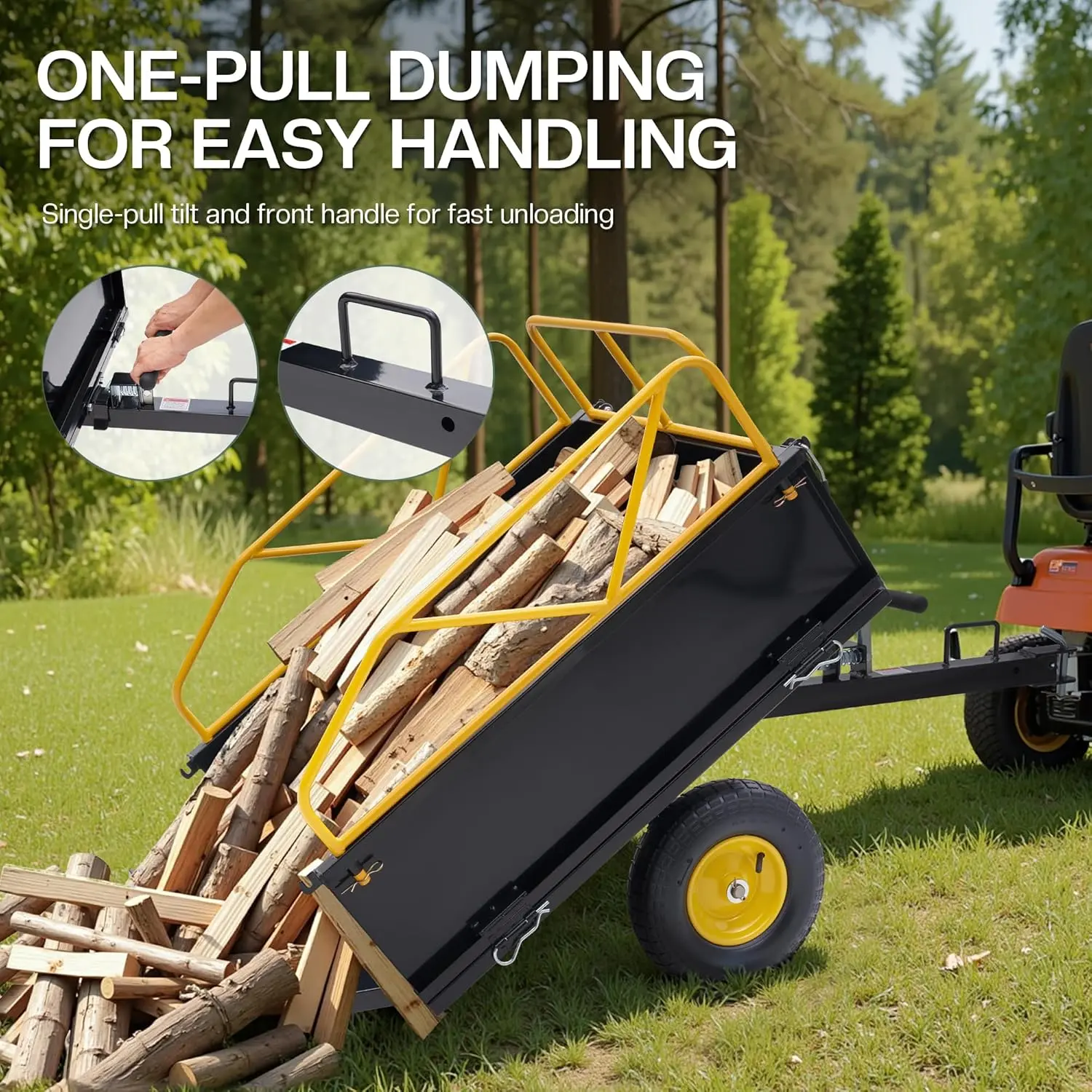 ·One-Pull Dumping: The yard trailer unloads with a single pull. A front handle offers easier hookup and maneuvering—ideal for solo users working in large yard areas