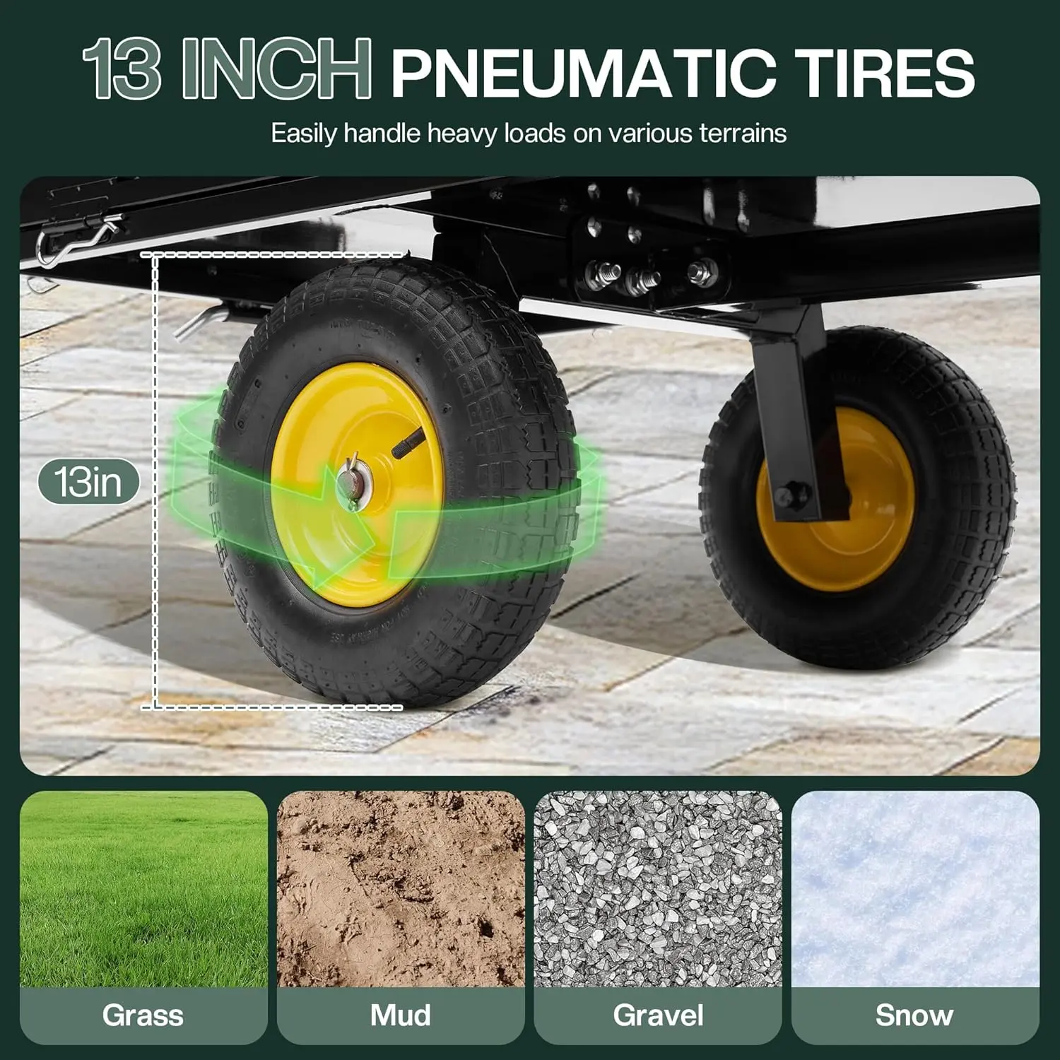 ·13" Pneumatic All-Terrain Tires: Equipped with 13-inch air-filled tires, this dump trailer glides over grass, gravel, mud, or snow with shock-absorbing stability and less fatigue