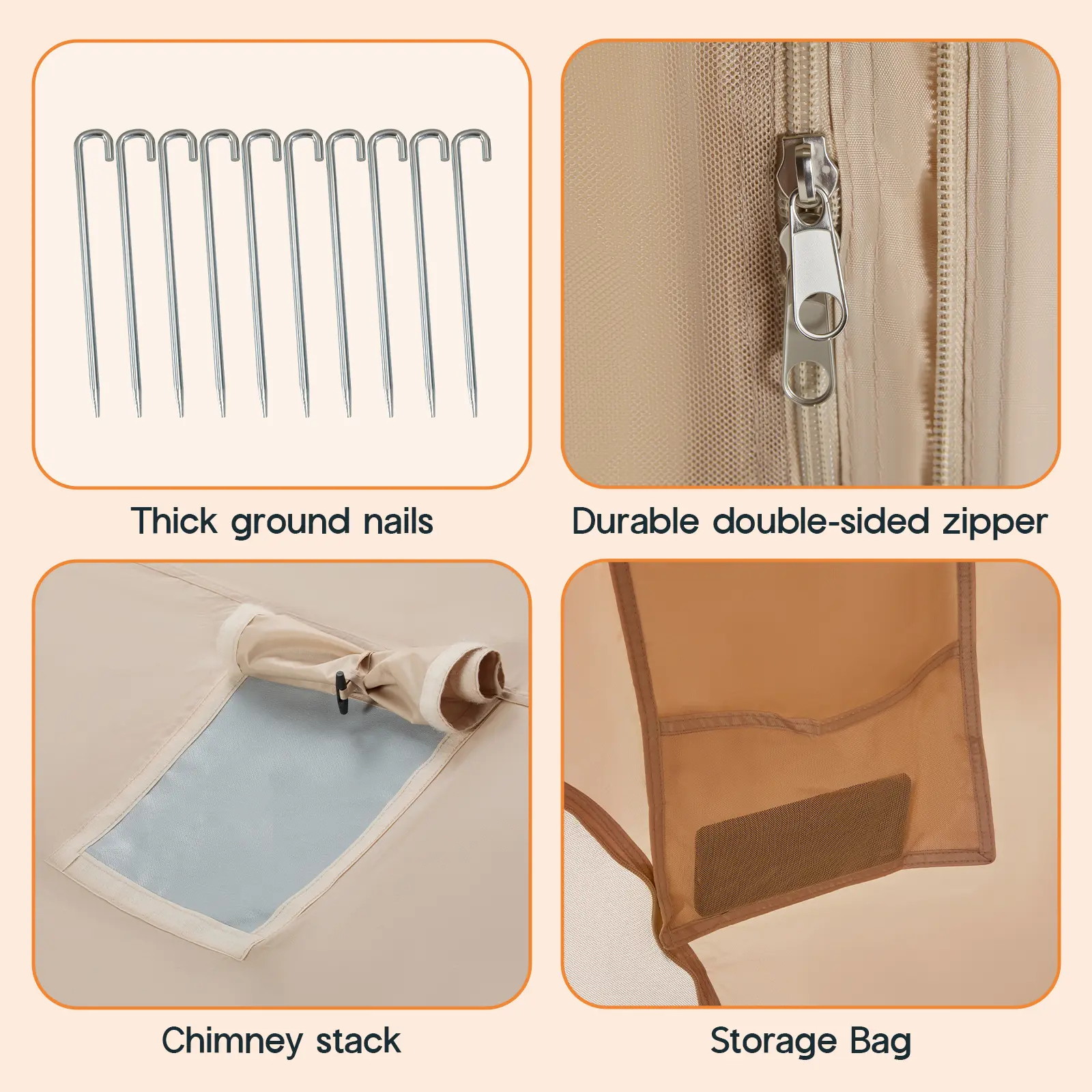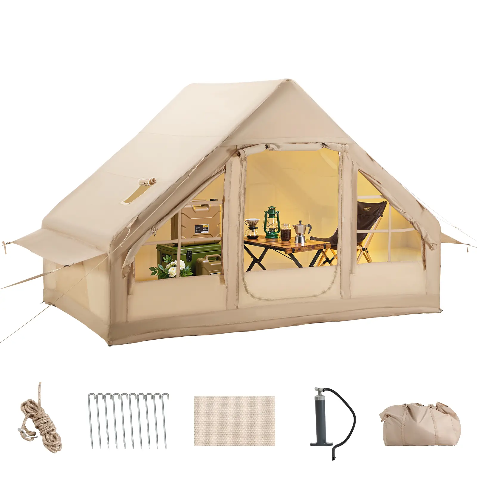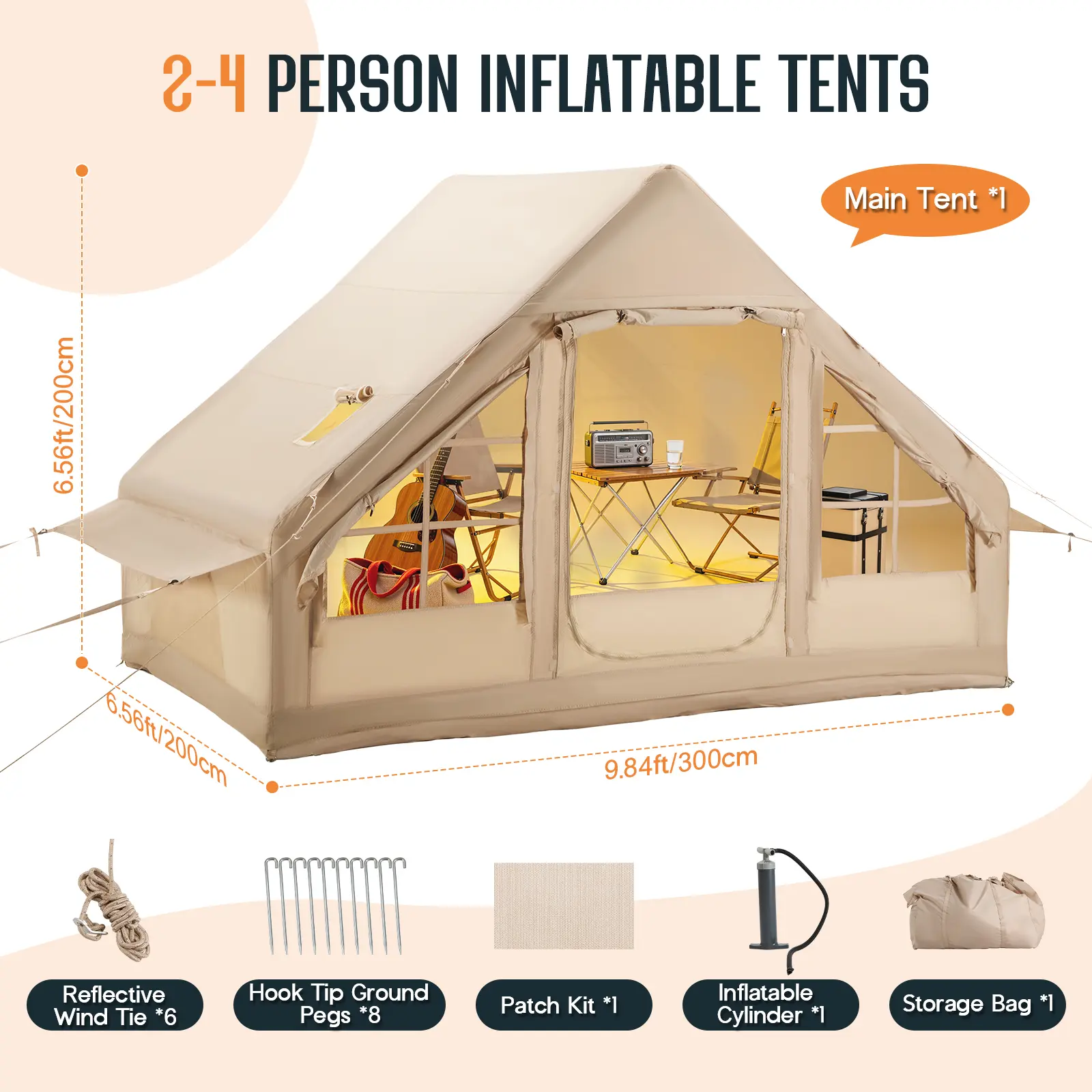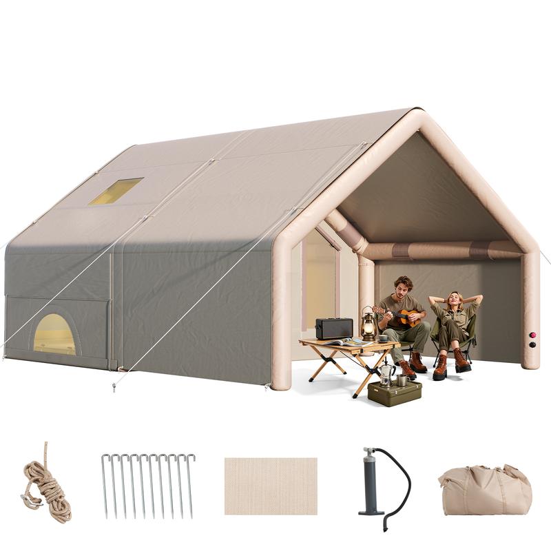 ·Convenient Details: Blow up camping tent comes with inner and outer double zippers for easy access, a complete accessory kit, and a portable carry bag for glamping, backyard, or emergency outdoor use