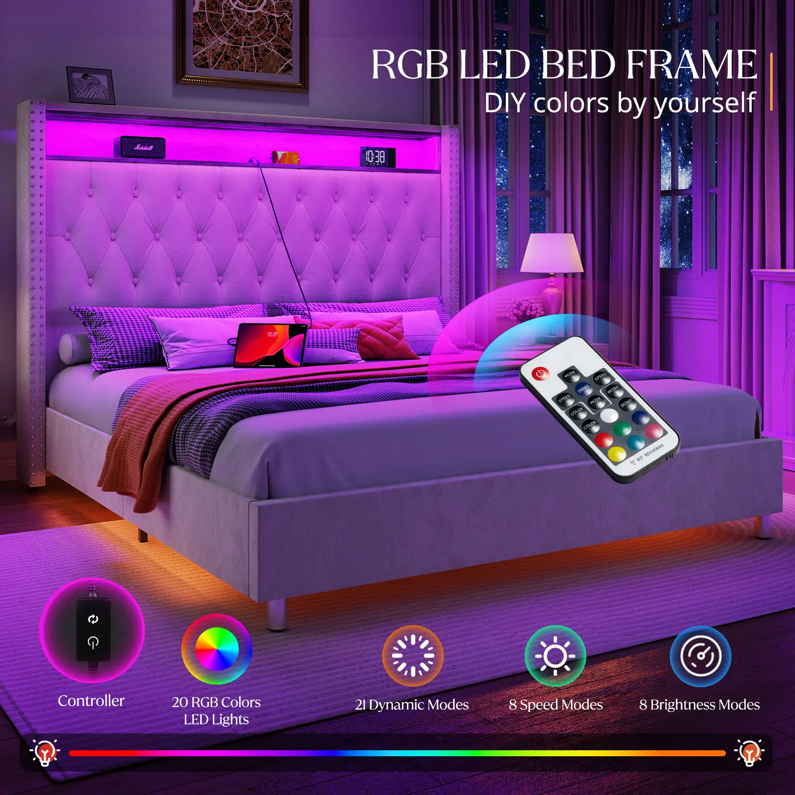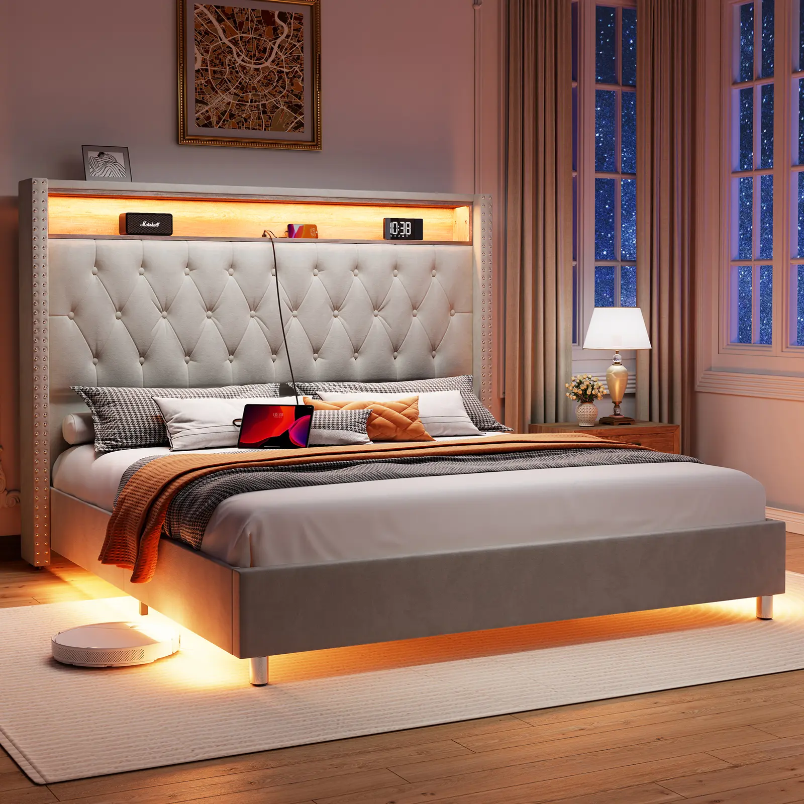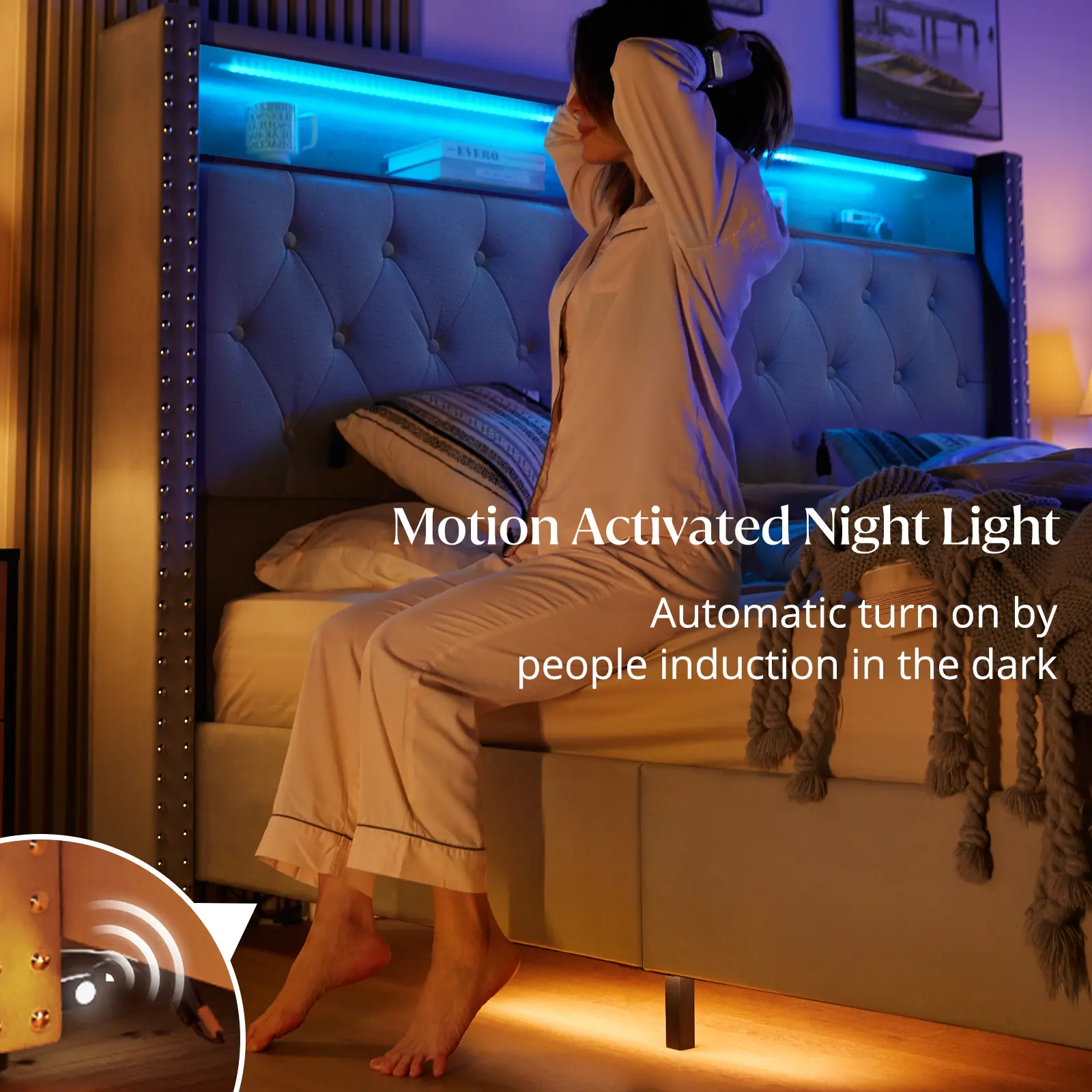Cream , Queen, With Motion Lights Under Bed