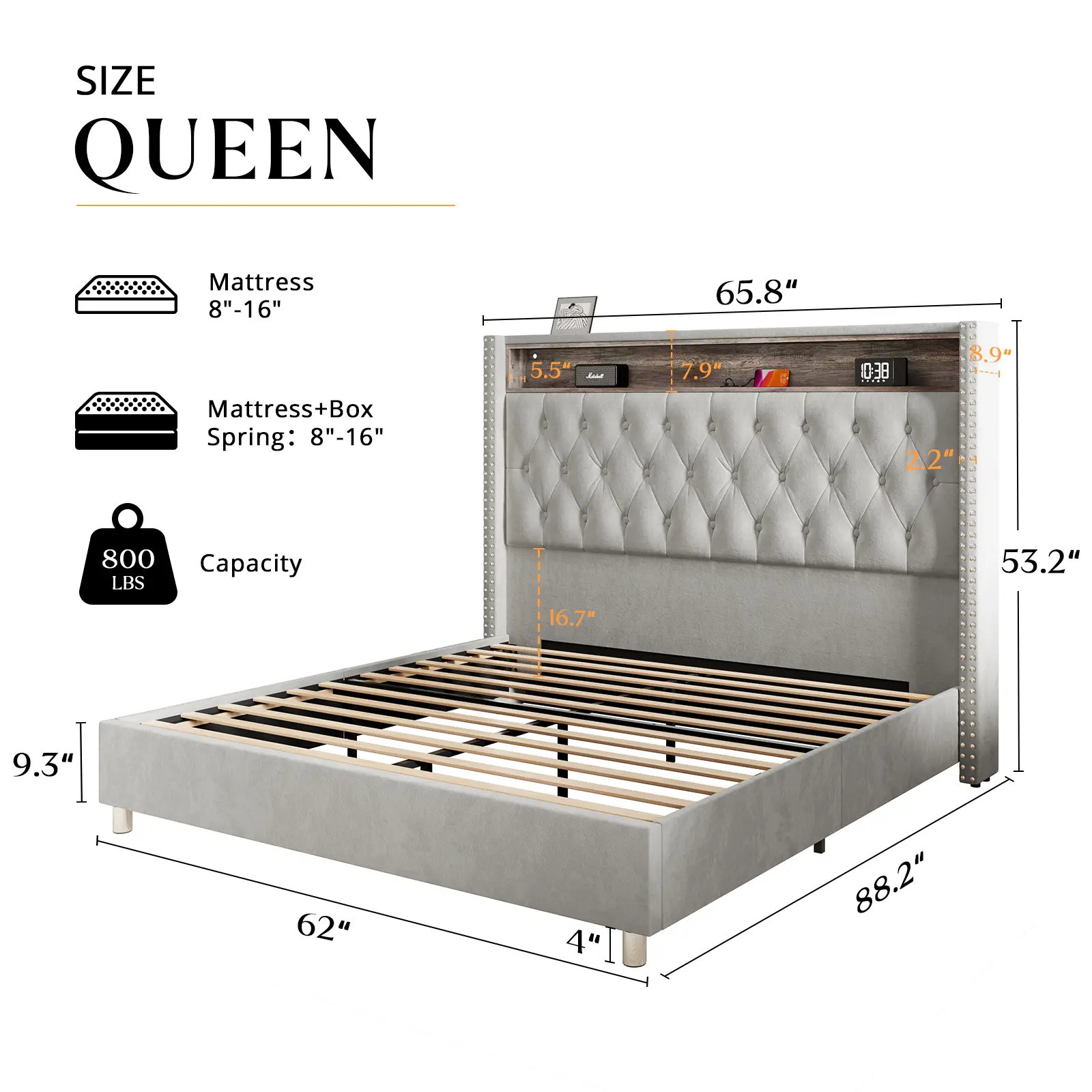Light Gray, Queen, With Motion Lights Under Bed