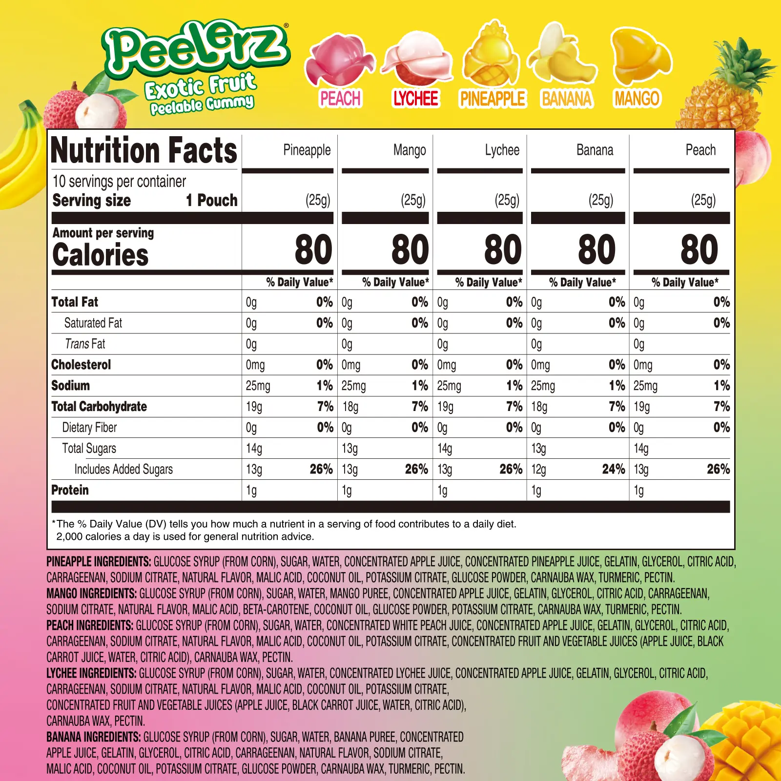 ·Five Fun Fruit Flavors: AMOS Peelerz Exotic Fruit Gummies come in 5 delicious and tropical flavors: Mango, Peach, Banana, Pineapple, and Lychee.