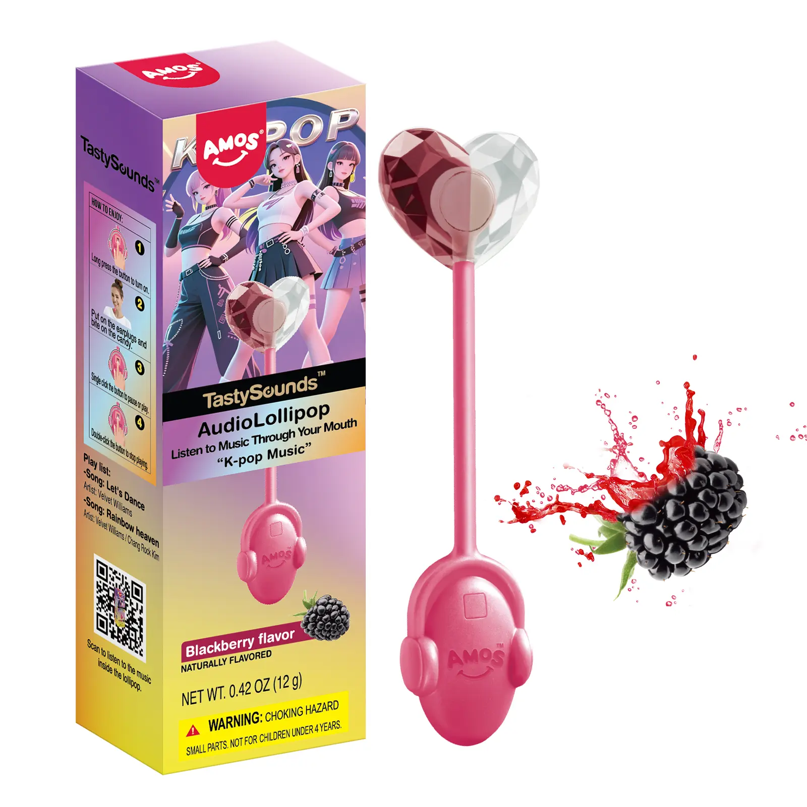 AMOS TastySounds Audio Lollipop combines sweet fruity flavors with built-in sound technology, letting you enjoy music in a completely new way — through your mouth.