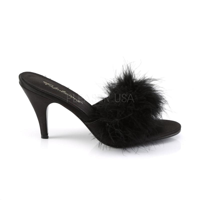 Elegant, mysterious, and undeniably seductive — the AMOUR-03 in black is a must-have for your boudoir collection. A 3-inch heel wrapped in satin and topped with soft marabou feathers makes this slide a favorite for burlesque, bedroom wear, or retro-chic lounging.