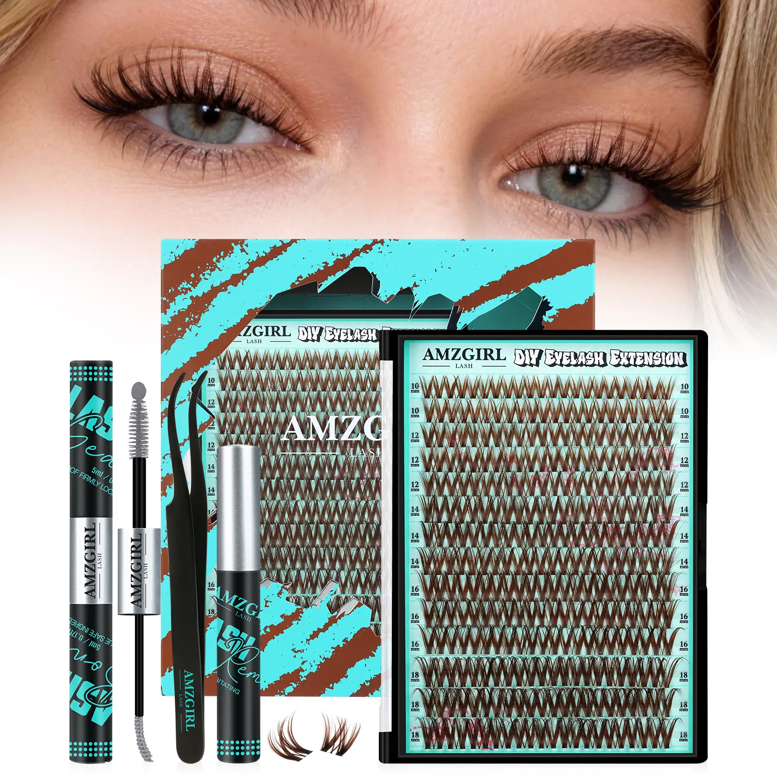 All-in-one brown lash cluster kit: 154pcs flaunt brown clusters + strong-hold gray glue & seal + remover + precision tweezer. Salon-worthy wispy lashes at home—no complexity, done in mins