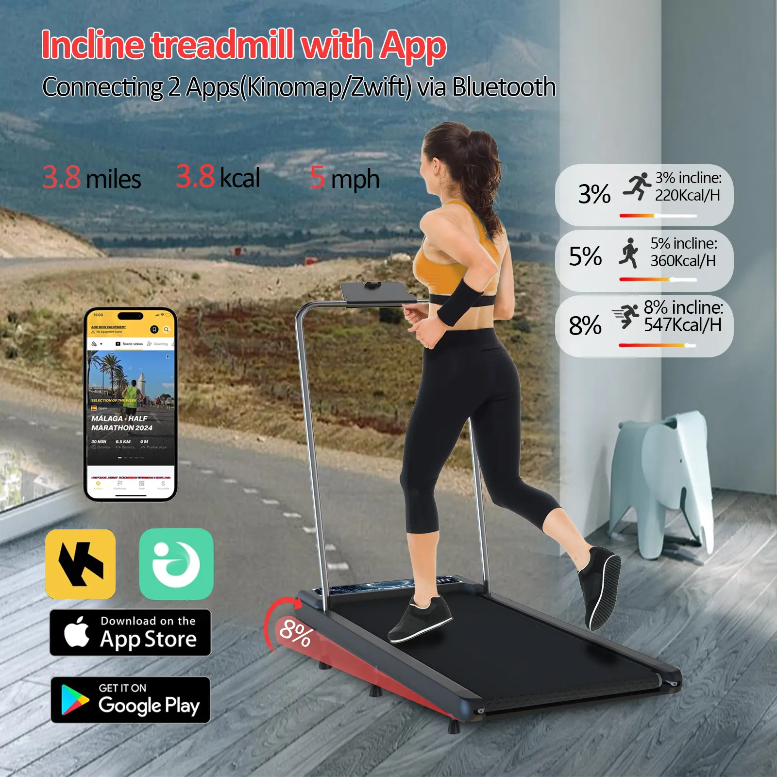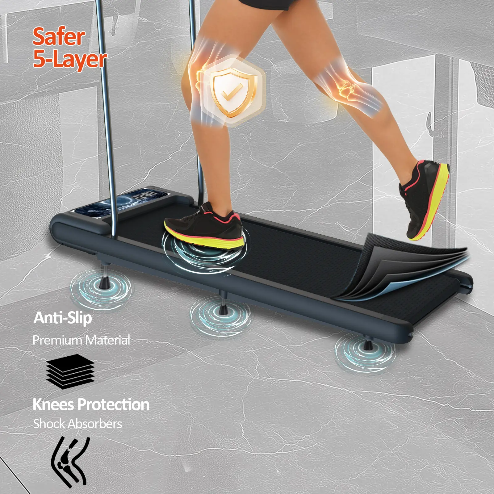 The 35.4" × 15.8" non-slip belt offers ample space for a natural stride. Silicone shock absorbers and rubber mats help minimize impact on joints. The knee-conscious running surface provides added comfort during use, making each session more enjoyable.