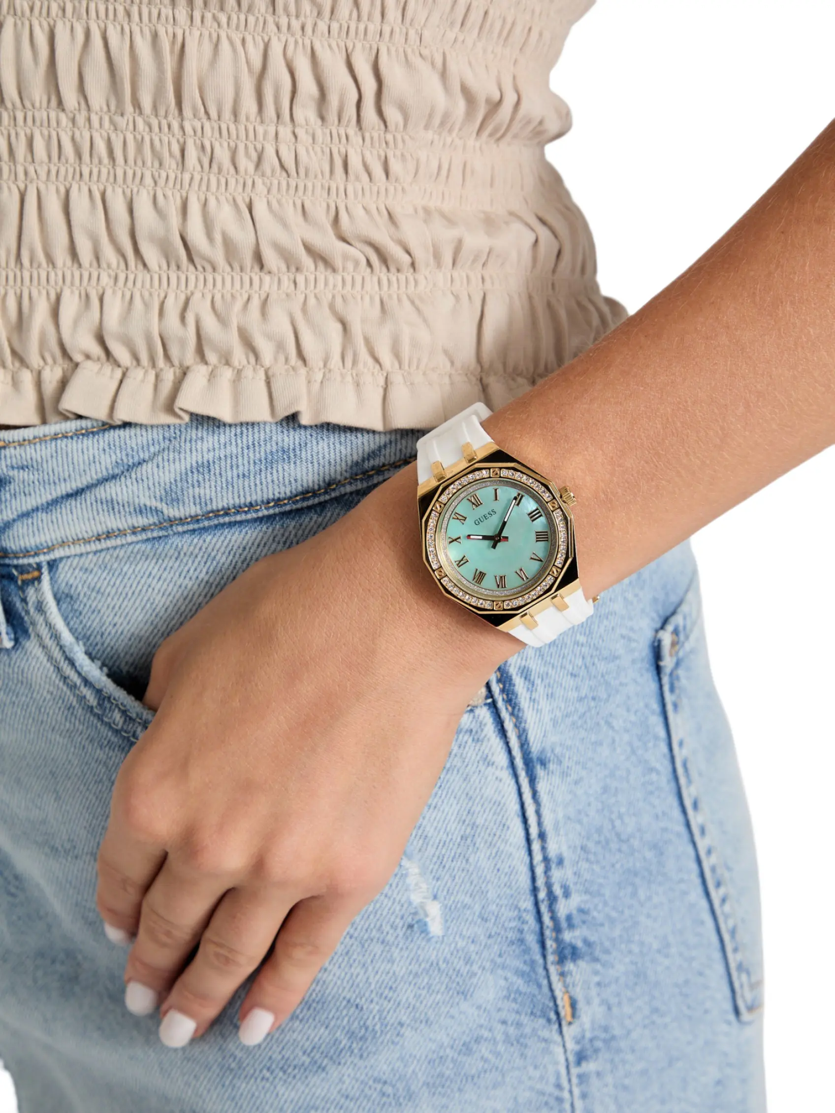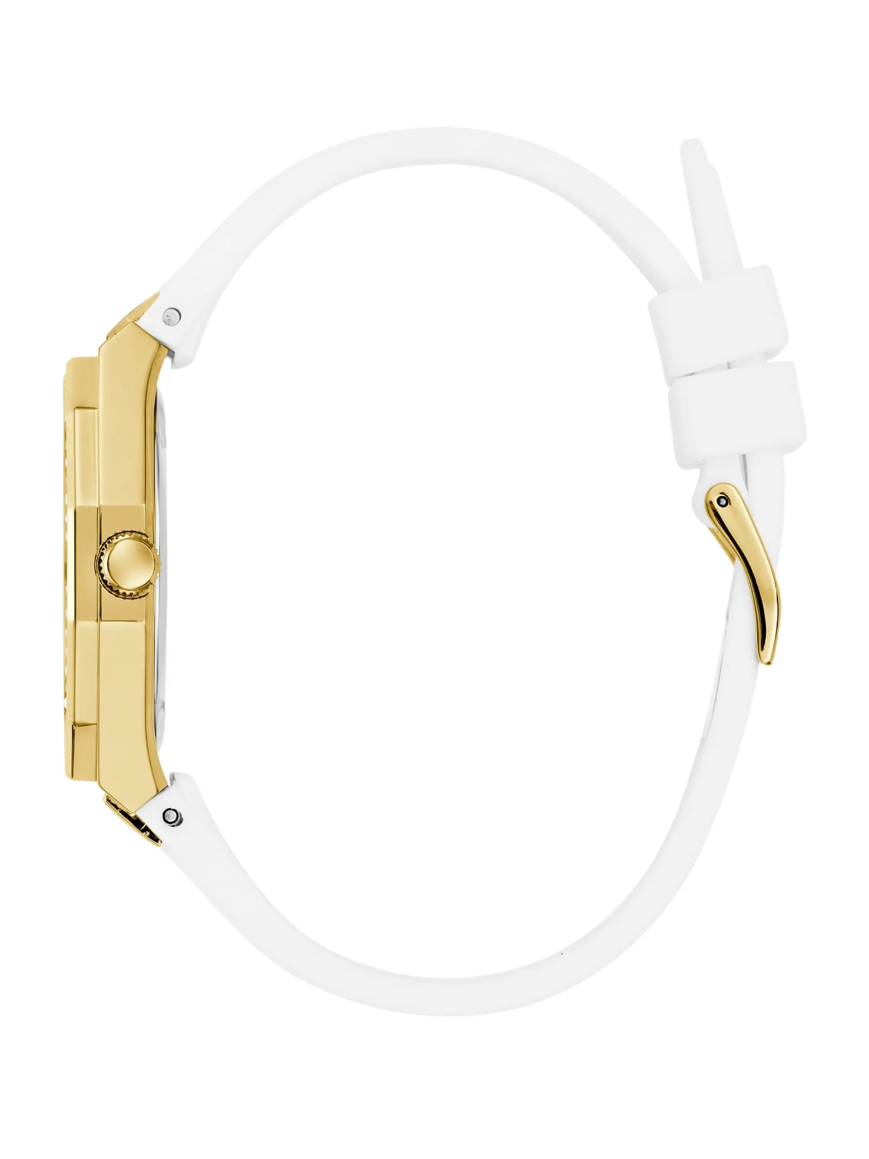 5. GUESS Female Gold-Tone and White Analog Watch