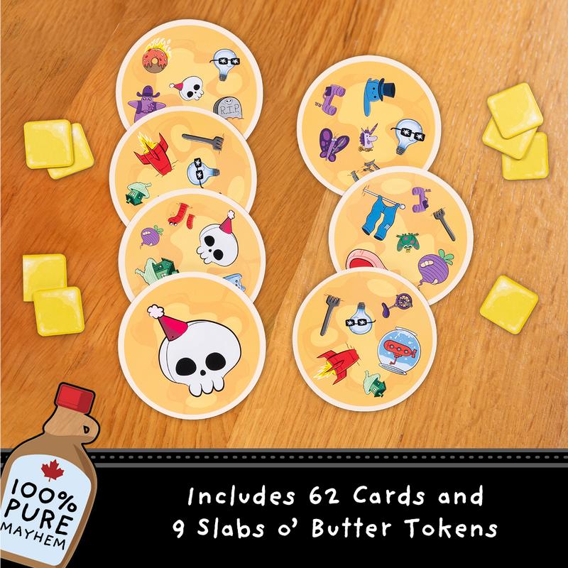 Anarchy Pancakes is Spot It with a twist, and we think that twist makes it a lot more fun and hectic. Going to the Draw Pile feels shamleful unless it pays off. Dropping a One-Topping card on an opponent feels so good! Earning that second slab o' butter to win the game is so relieving!
